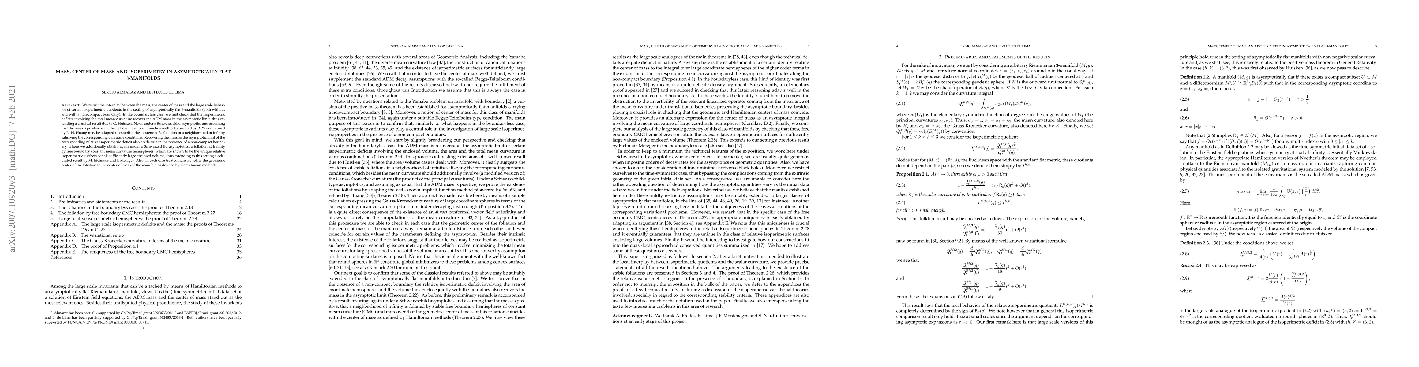 This paper explores the relationship between mass, center of mass, and isoperimetry in asymptotically flat 3-manifolds, demonstrating that the isoperimetric deficit involving mean curvature converges to the ADM mass in the asymptotic limit. It also establishes the existence of specific foliations at infinity under Schwarzschild asymptotics and relates the geometric center of these foliations to the manifold's center of mass.