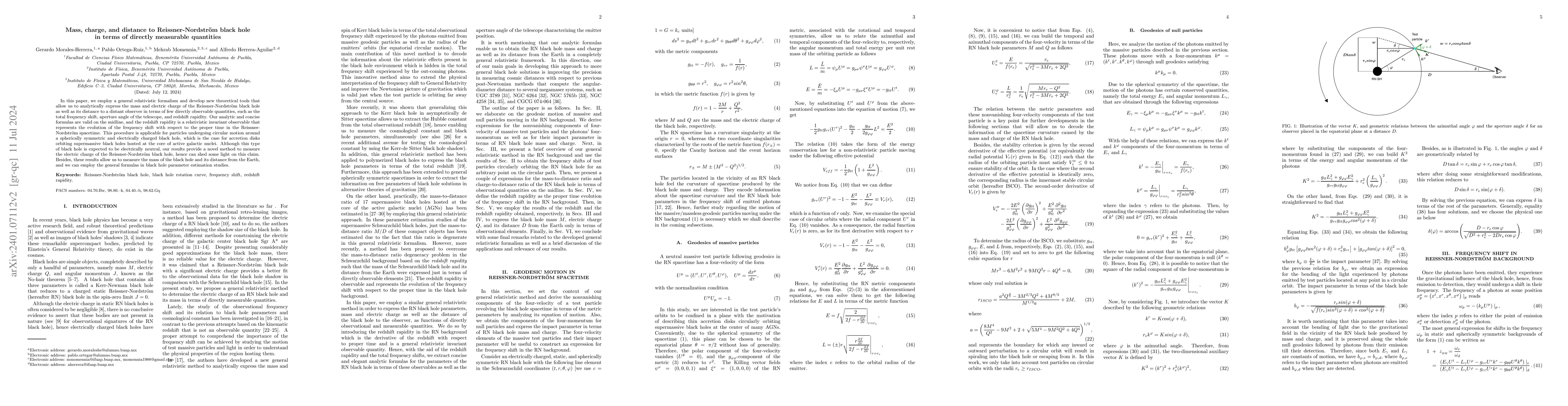 This paper develops new theoretical tools to express the mass, charge, and distance of a Reissner-Nordström black hole in terms of directly measurable quantities like frequency shift and redshift rapidity. The results provide a novel method for estimating black hole parameters, especially useful for accretion disks around supermassive black holes.