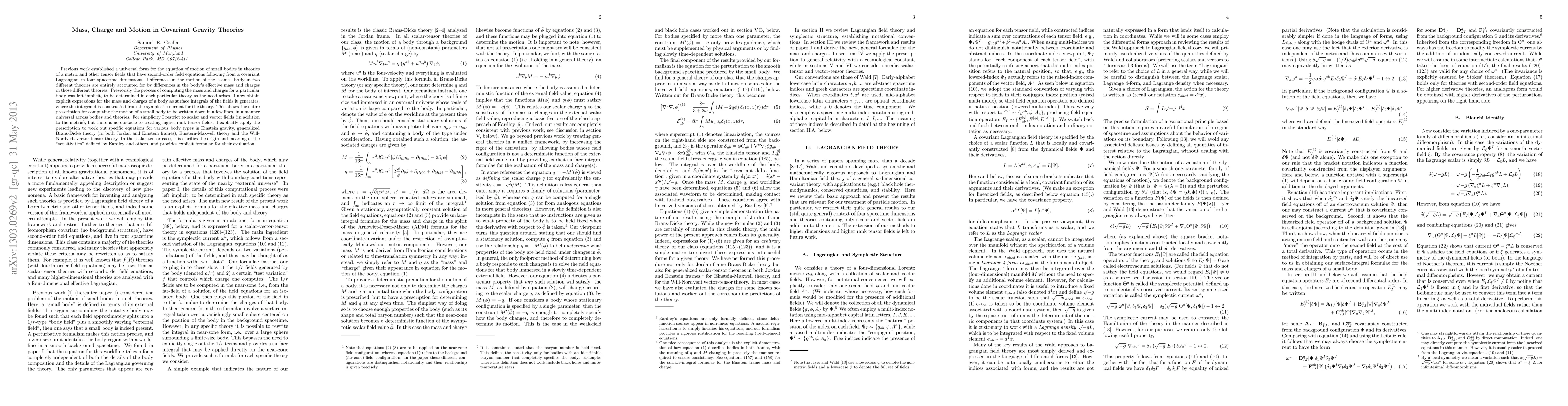 Previous work established a universal form for the equation of motion of small bodies in theories of a metric and other tensor fields that have second-order field equations following from a covariant Lagrangian in four spacetime dimensions. Differences in the motion of the "same" body in two different theories are entirely accounted for by differences in the body's effective mass and charges in those different theories. Previously the process of computing the mass and charges for a particular body was left implicit, to be determined in each particular theory as the need arises. I now obtain explicit expressions for the mass and charges of a body as surface integrals of the fields it generates, where the integrand is constructed from the symplectic current for the theory. This allows the entire prescription for computing the motion of a small body to be written down in a few lines, in a manner universal across bodies and theories. For simplicity I restrict to scalar and vector fields (in addition to the metric), but there is no obstacle to treating higher-rank tensor fields. I explicitly apply the prescription to work out specific equations for various body types in Einstein gravity, generalized Brans-Dicke theory (in both Jordan and Einstein frames), Einstein-Maxwell theory and the Will-Nordvedt vector-tensor theory. In the scalar-tensor case, this clarifies the origin and meaning of the "sensitivities" defined by Eardley and others, and provides explicit formulae for their evaluation.