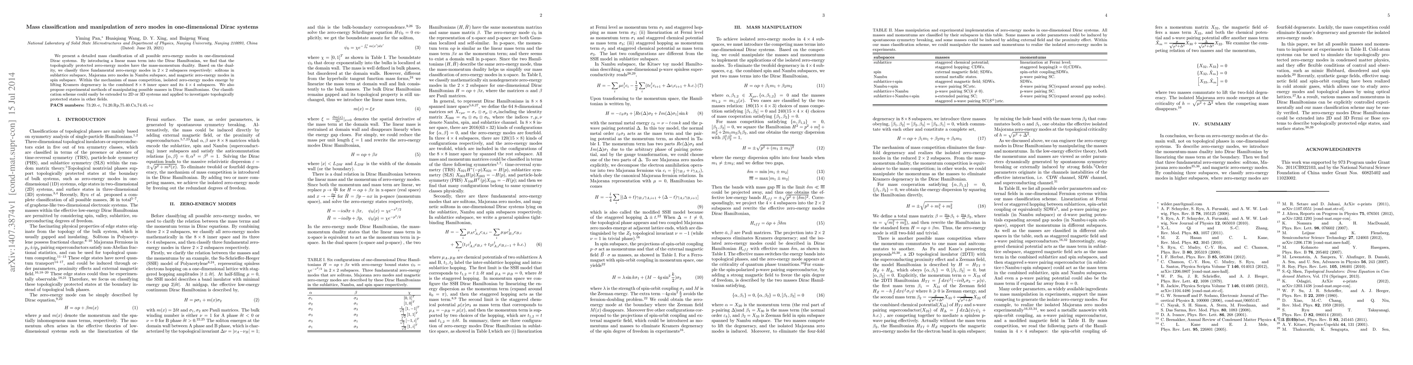 This paper classifies zero-energy modes in one-dimensional Dirac systems by introducing a mass term, revealing mass-momentum duality and identifying three fundamental zero modes. It proposes methods to manipulate these modes and suggests the classification scheme can be extended to higher dimensions.