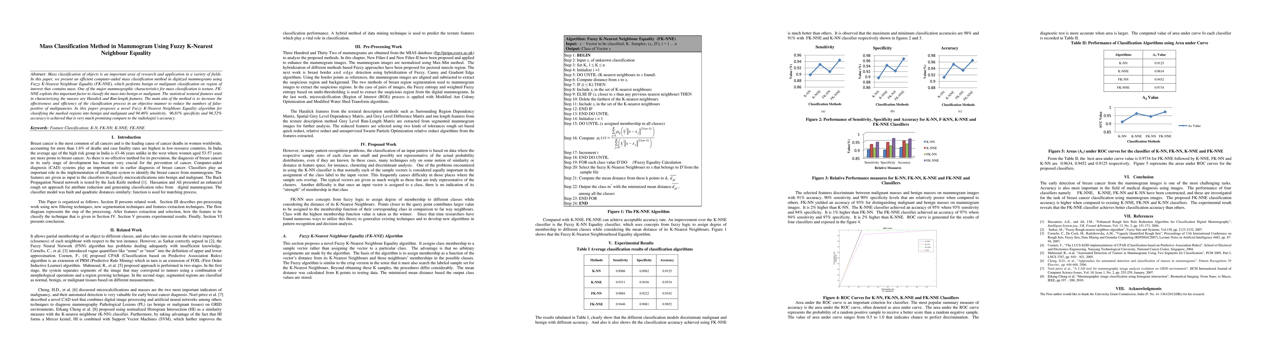 This paper introduces a novel Fuzzy K-Nearest Neighbor Equality algorithm for classifying masses in digitized mammograms as benign or malignant, leveraging texture features like Haralick and Run length. The method achieves high sensitivity, specificity, and accuracy, outperforming radiologists' accuracy and aiming to reduce false positives.
