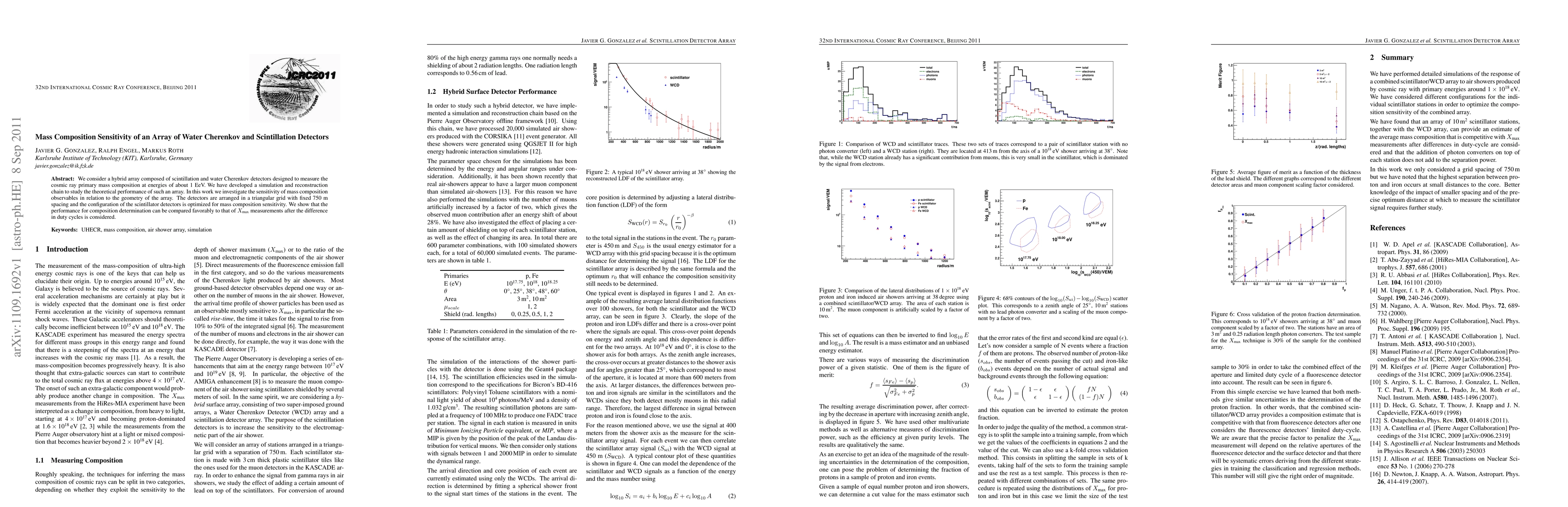 Researchers developed a hybrid array of water Cherenkov and scintillation detectors to measure cosmic ray primary mass composition at high energies. They found that the arrangement's geometry significantly impacts performance.