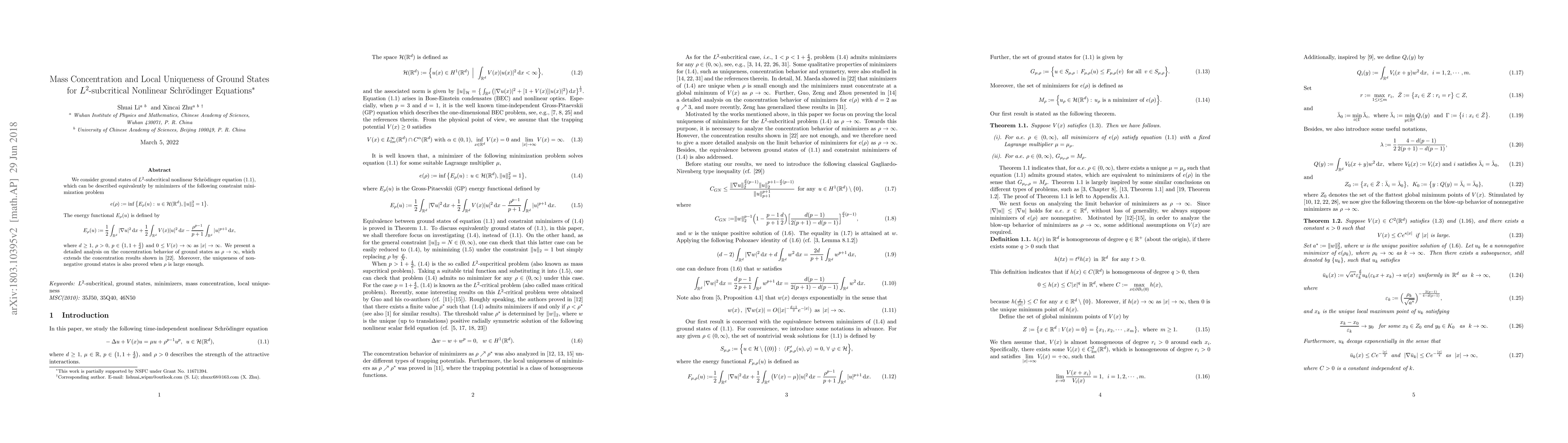This paper investigates ground states of $L^2$-subcritical nonlinear Schrödinger equations, focusing on their mass concentration behavior as a parameter $\rho$ tends to infinity and proving local uniqueness for large $\rho$. The study extends previous concentration results and establishes the uniqueness of nonnegative ground states under certain conditions.