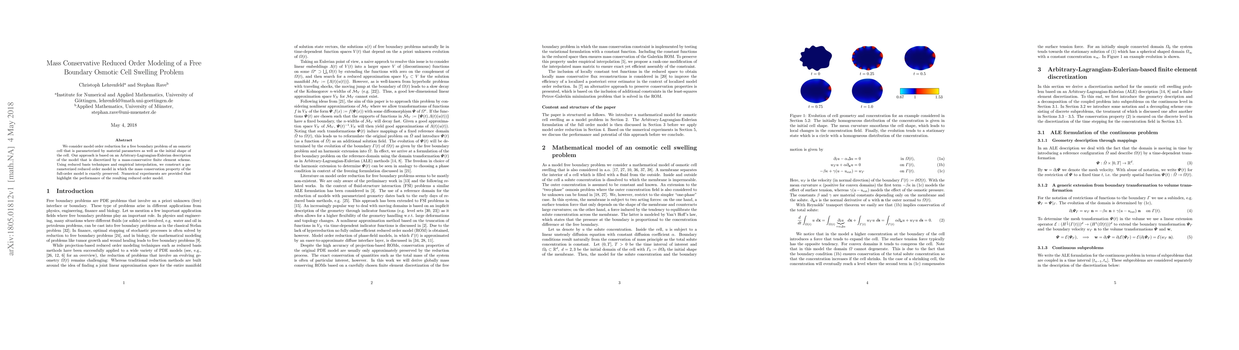 We consider model order reduction for a free boundary problem of an osmotic cell that is parameterized by material parameters as well as the initial shape of the cell. Our approach is based on an Arbitrary-Lagrangian-Eulerian description of the model that is discretized by a mass-conservative finite element scheme. Using reduced basis techniques and empirical interpolation, we construct a parameterized reduced order model in which the mass conservation property of the full-order model is exactly preserved. Numerical experiments are provided that highlight the performance of the resulting reduced order model.