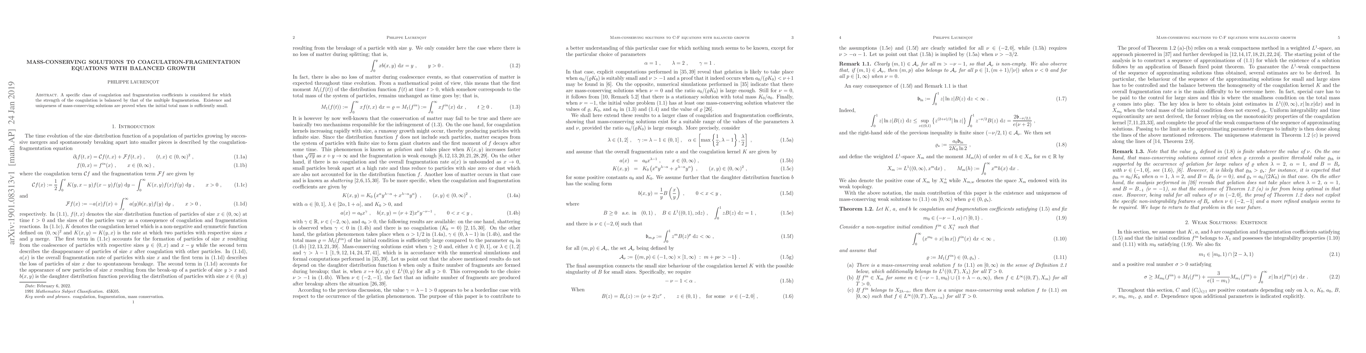 Summary: This paper proves the existence and uniqueness of mass-conserving solutions to coagulation-fragmentation equations under balanced growth conditions, where the strength of coagulation is matched by that of multiple fragmentation, provided the initial total mass is sufficiently small.