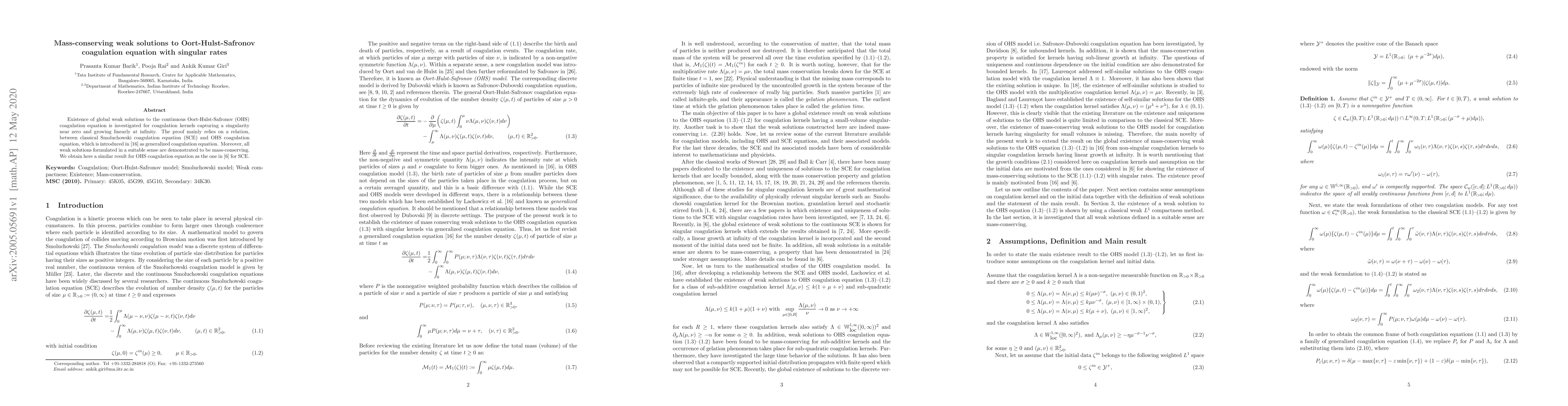 This paper investigates the existence of global weak solutions to the Oort-Hulst-Safronov (OHS) coagulation equation with singular coagulation rates. It demonstrates that all weak solutions are mass-conserving, extending similar results from the classical Smoluchowski coagulation equation.