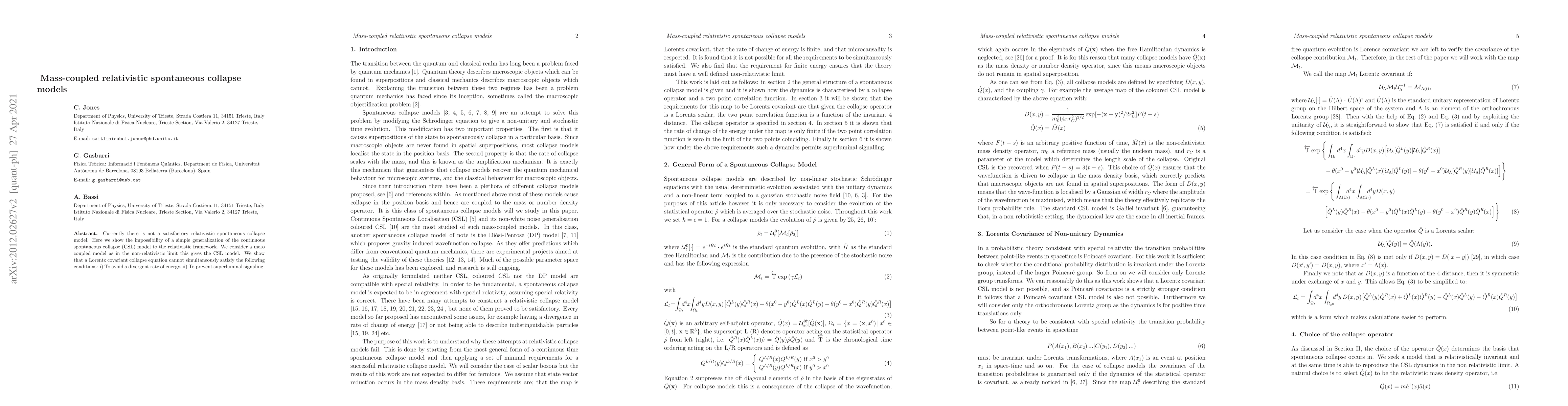 This paper demonstrates that a mass-coupled relativistic generalization of the continuous spontaneous collapse (CSL) model is impossible. It shows that a Lorentz covariant collapse equation cannot meet both the requirement of a non-divergent energy rate and the prevention of superluminal signaling.