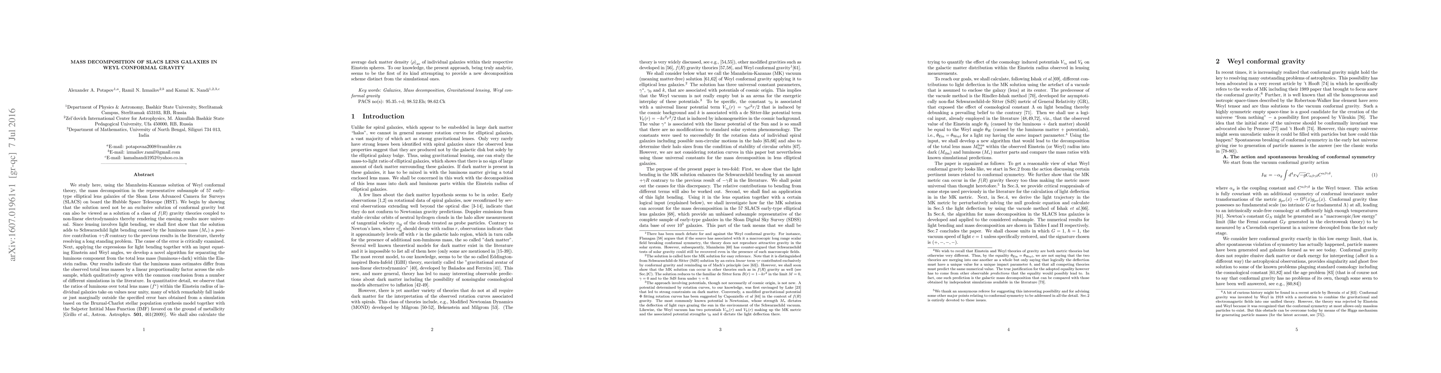 We study here, using the Mannheim-Kazanas solution of Weyl conformal theory, the mass decomposition in the representative subsample of $57$ early-type elliptical lens galaxies of the SLACS on board the HST. We begin by showing that the solution need not be an exclusive solution of conformal gravity but can also be viewed as a solution of a class of $f(R)$ gravity theories coupled to non-linear electrodynamics thereby rendering the ensuing results more universal. Since lensing involves light bending, we shall first show that the solution adds to Schwarzschild light bending caused by the luminous mass ($M_{\ast }$) a positive contribution $+\gamma R$ contrary to the previous results in the literature, thereby resolving a long standing problem. The cause of the error is critically examined. Applying the expressions for light bending together with an input equating Einstein and Weyl angles, we develop a novel algorithm for separating the luminous component from the total lens mass (luminous+dark) within the Einstein radius. Our results indicate that the luminous mass estimates differ from the observed total lens masses by a linear proportionality factor. In quantitative detail, we observe that the ratios of luminous over total lens mass ($f^{\ast }$) within the Einstein radius of individual galaxies take on values near unity, many of which remarkably fall inside or just marginally outside the specified error bars obtained from a simulation based on the Bruzual-Charlot stellar population synthesis model together with the Salpeter IMF favored on the ground of metallicity [Grillo,2009]. We shall also calculate the average dark matter density of individual galaxies within their respective Einstein spheres. The present approach, being truly analytic, seems to be the first of its kind attempting to provide a new decomposition scheme distinct from the simulational ones.