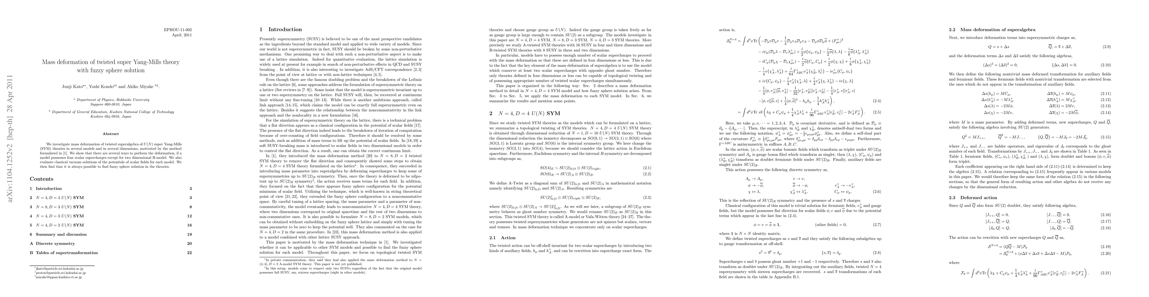 We investigate mass deformation of twisted superalgebra of U(N) super Yang-Mills (SYM) theories in several models and in several dimensions, motivated by the method formulated in [1]. We show that there are several ways to perform the deformation, if a model possesses four scalar supercharges except for two dimensional B-model. We also evaluate classical vacuum solutions of the potentials of scalar fields for each model. We then find that it is always possible to find fuzzy sphere solution in the theories.