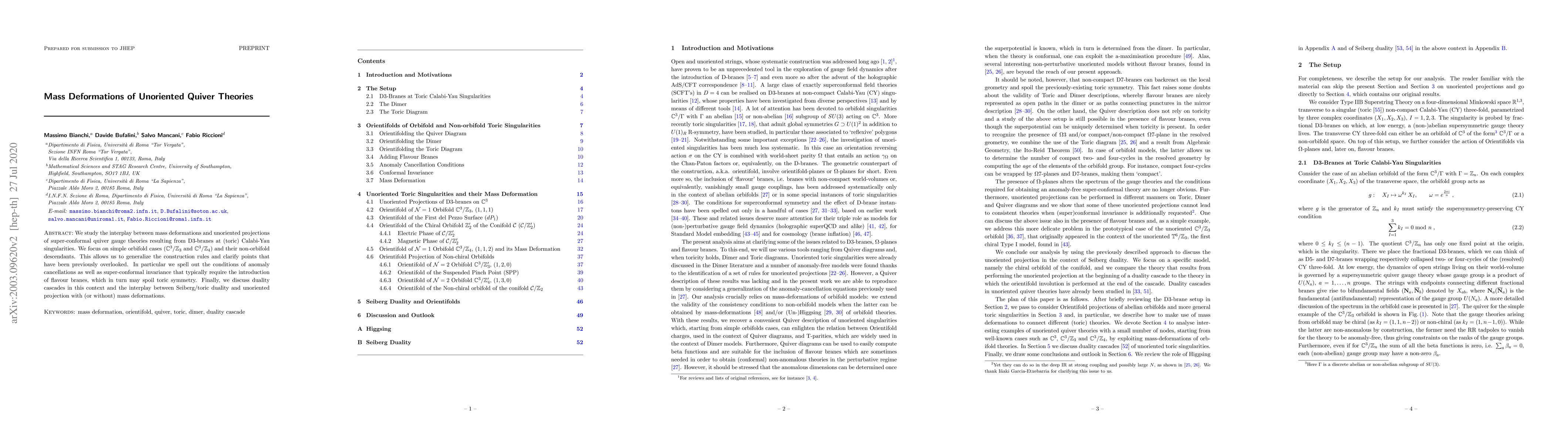 We study the interplay between mass deformations and unoriented projections of super-conformal quiver gauge theories resulting from D3-branes at (toric) Calabi-Yau singularities. We focus on simple orbifold cases ($\mathbb{C}^3/\mathbb{Z}_3$ and $\mathbb{C}^3/\mathbb{Z}_4$) and their non-orbifold descendants. This allows us to generalize the construction rules and clarify points that have been previously overlooked. In particular we spell out the conditions of anomaly cancellations as well as super-conformal invariance that typically require the introduction of flavour branes, which in turn may spoil toric symmetry. Finally, we discuss duality cascades in this context and the interplay between Seiberg/toric duality and unoriented projection with (or without) mass deformations.