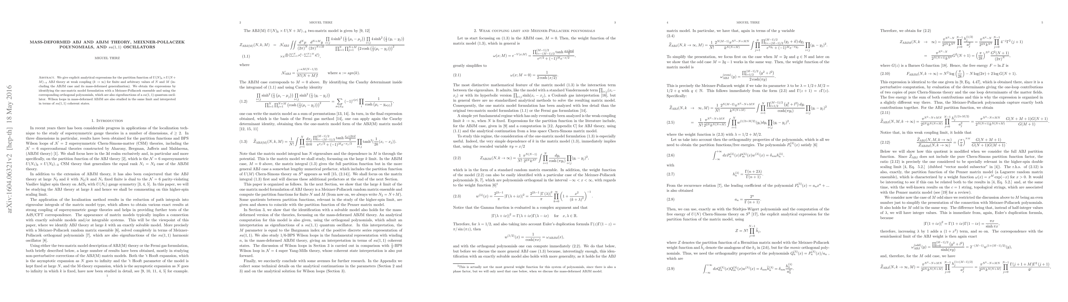 We give explicit analytical expressions for the partition function of $U(N)_{k}\times U(N+M)_{-k}$ ABJ theory at weak coupling ($k\rightarrow \infty )$ for finite and arbitrary values of $N$ and $M$ (including the ABJM case and its mass-deformed generalization). We obtain the expressions by identifying the one-matrix model formulation with a Meixner-Pollaczek ensemble and using the corresponding orthogonal polynomials, which are also eigenfunctions of a $su(1,1)$ quantum oscillator. Wilson loops in mass-deformed ABJM are also studied in the same limit and interpreted in terms of $su(1,1)$ coherent states.