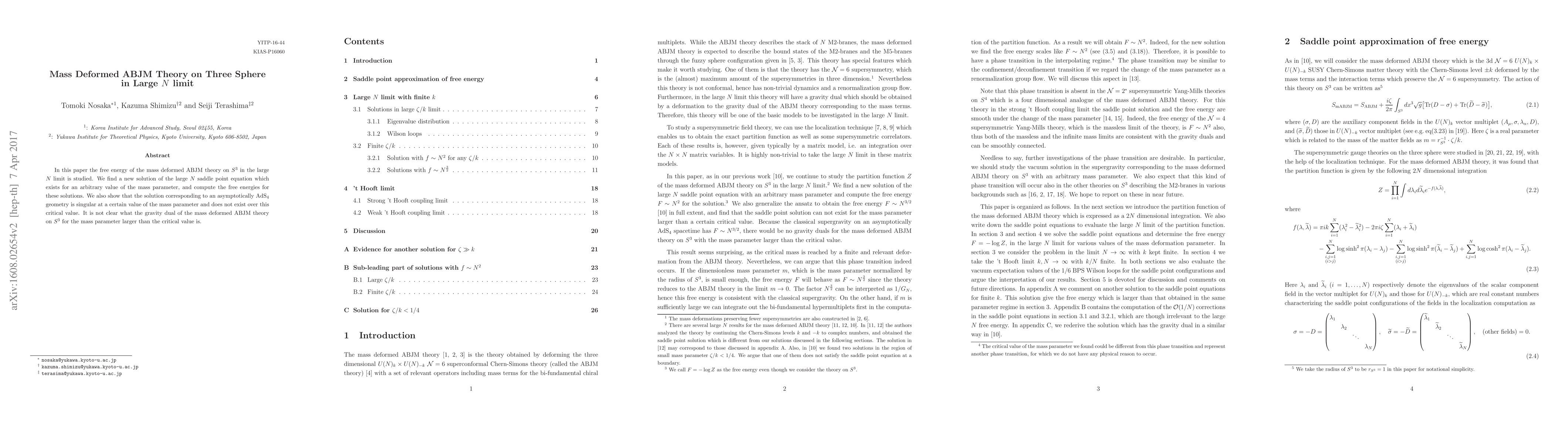 This paper studies the free energy of the mass deformed ABJM theory on S^3 in the large N limit, discovering a new large N saddle point solution for any mass parameter and computing associated free energies. It finds that solutions corresponding to asymptotically AdS_4 geometries become singular above a critical mass value, leaving the gravity dual for higher mass parameters unclear.