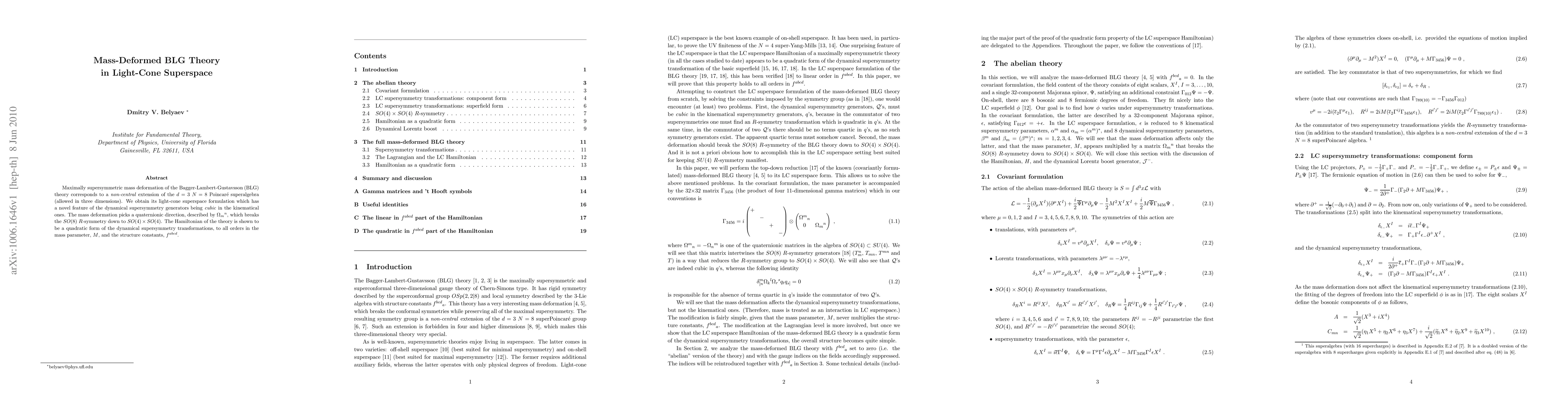 This paper presents a light-cone superspace formulation for the mass-deformed BLG theory, featuring dynamical supersymmetry generators cubic in kinematical ones. The mass deformation breaks the SO(8) R-symmetry down to SO(4)xSO(4) and the Hamiltonian is quadratic in the dynamical supersymmetry transformations, valid to all orders in the mass parameter.