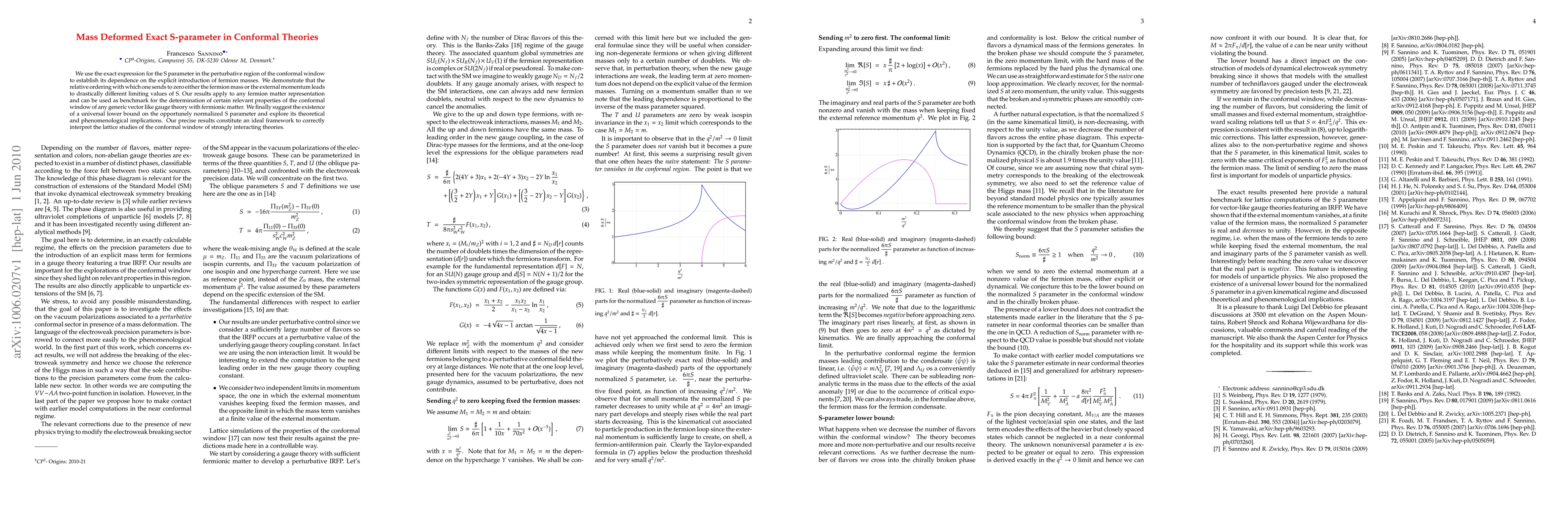 We use the exact expression for the S parameter in the perturbative region of the conformal window to establish its dependence on the explicit introduction of fermion masses. We demonstrate that the relative ordering with which one sends to zero either the fermion mass or the external momentum leads to drastically different limiting values of S. Our results apply to any fermion matter representation and can be used as benchmark for the determination of certain relevant properties of the conformal window of any generic vector like gauge theory with fermionic matter. We finally suggest the existence of a universal lower bound on the opportunely normalized S parameter and explore its theoretical and phenomenological implications. Our exact results constitute an ideal framework to correctly interpret the lattice studies of the conformal window of strongly interacting theories.