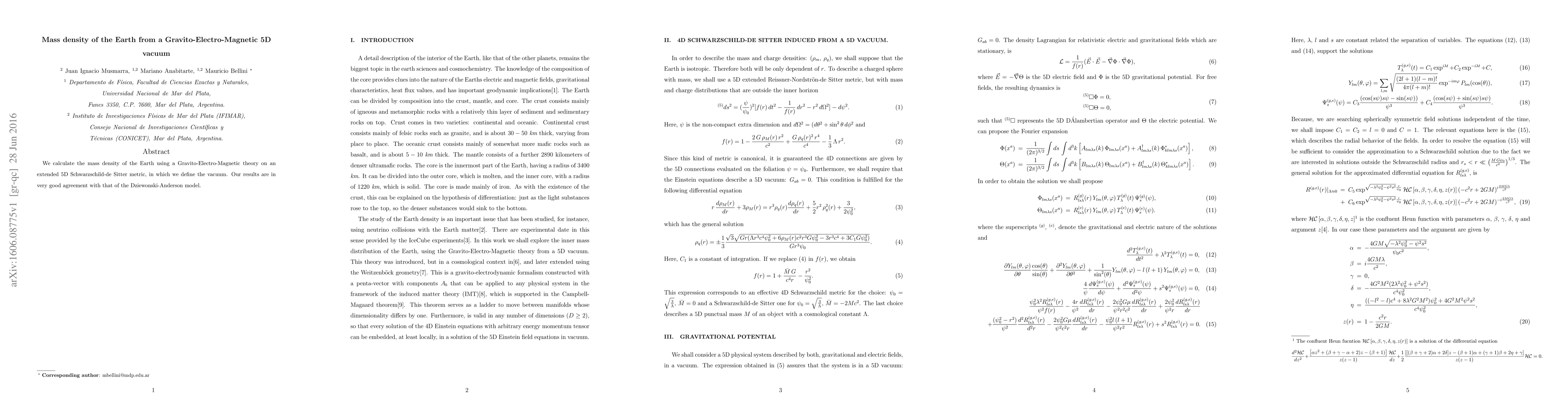 We calculate the mass density of the Earth using a Gravito-Electro-Magnetic theory on an extended 5D Schwarzschild-de Sitter metric, in which we define the vacuum. Our results are in very good agreement with that of the Dziewonski-Anderson model.