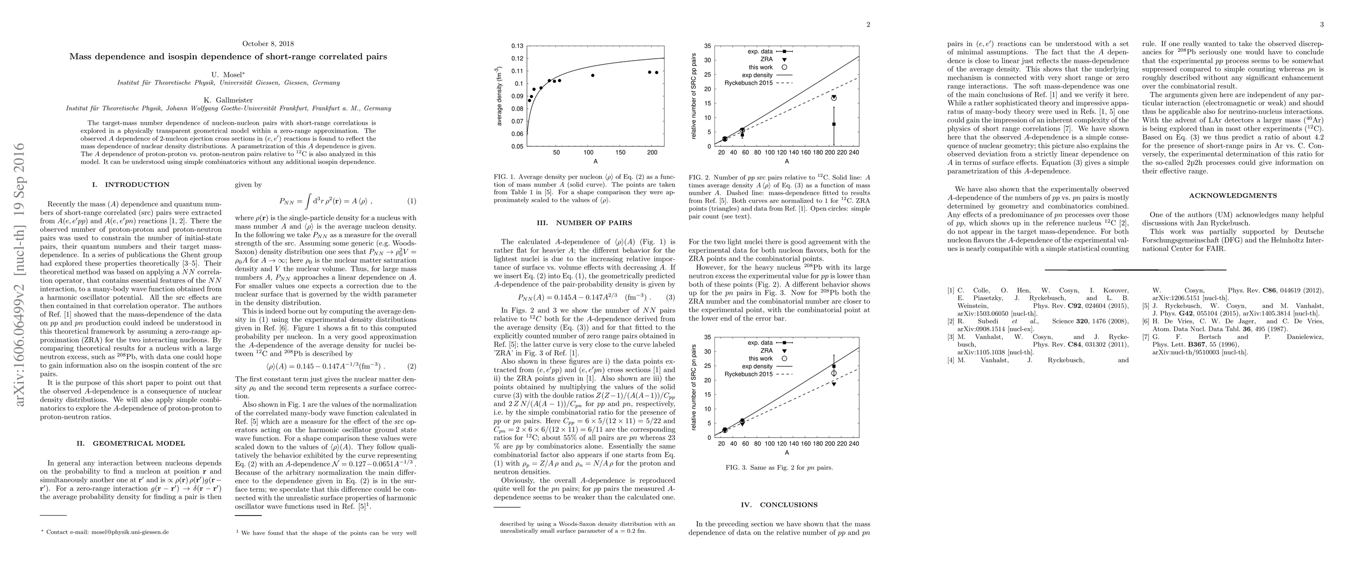 This paper explores the mass dependence of short-range correlated nucleon pairs using a geometrical zero-range model, finding that the observed ejection cross sections reflect nuclear density distributions. The study also analyzes the relative $A$ dependence of proton-proton vs. proton-neutron pairs, revealing no additional isospin dependence beyond simple combinatorics.