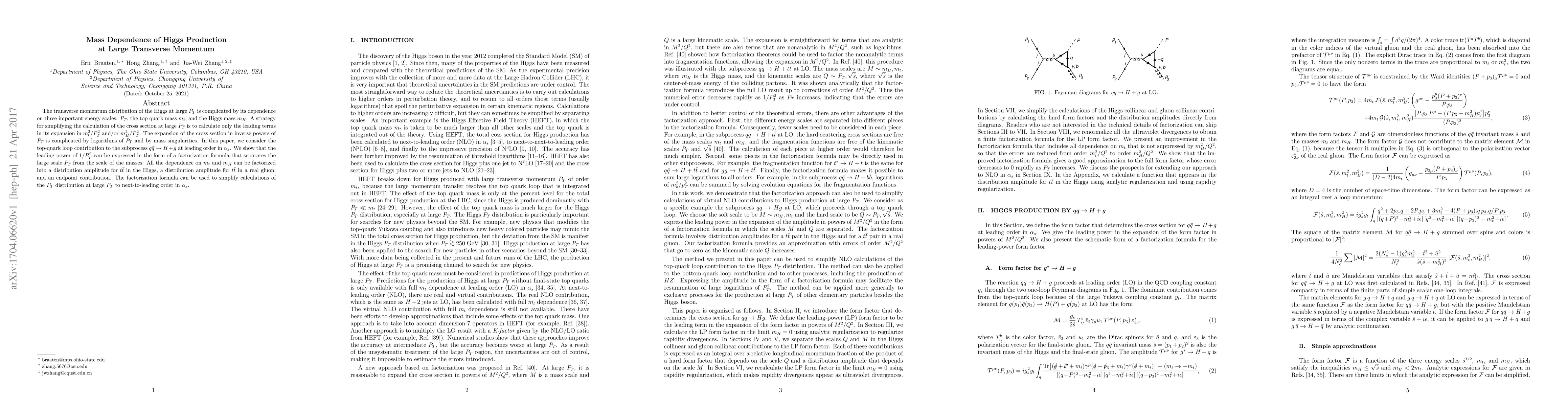 This paper investigates the transverse momentum distribution of Higgs bosons at large $P_T$, focusing on simplifying calculations by factorizing mass dependencies. It presents a factorization formula that separates the large $P_T$ scale from mass scales, enabling next-to-leading order calculations in $\alpha_s$.
