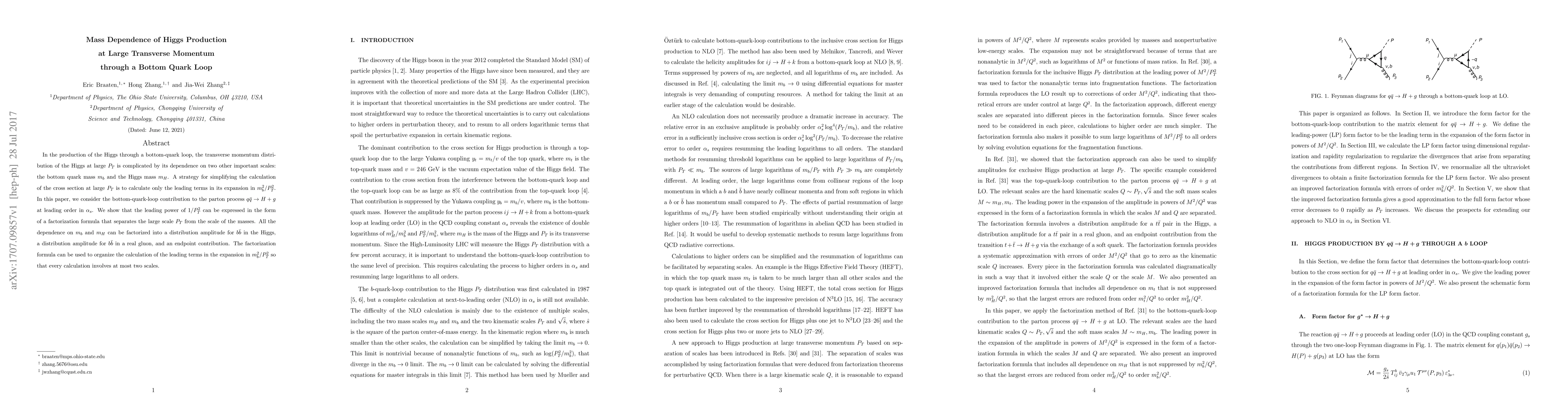 This paper explores the Higgs production via a bottom-quark loop at large transverse momentum, introducing a factorization formula that simplifies the calculation by separating the large momentum scale from the quark and Higgs masses. The approach isolates the dependence on $m_b$ and $m_H$ into specific distribution amplitudes and endpoint contributions.