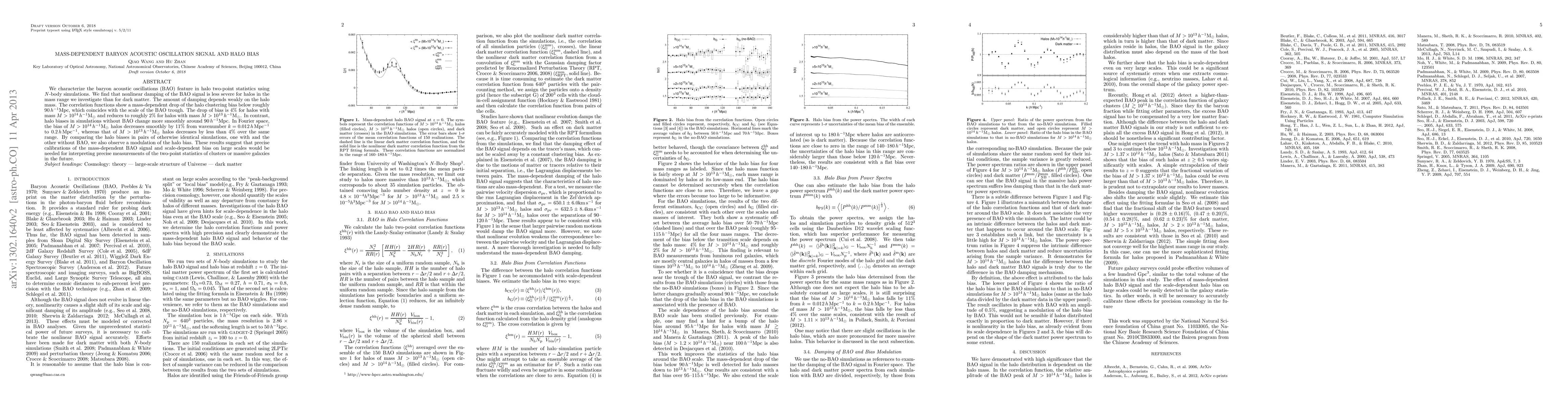 We characterize the baryon acoustic oscillations (BAO) feature in halo two-point statistics using N-body simulations. We find that nonlinear damping of the BAO signal is less severe for halos in the mass range we investigate than for dark matter. The amount of damping depends weakly on the halo mass. The correlation functions show a mass-dependent drop of the halo clustering bias below roughly 90 Mpc/h, which coincides with the scale of the BAO trough. The drop of bias is 4% for halos with mass M>10^{14} Msun/h and reduces to roughly 2% for halos with mass M>10^{13} Msun/h. In contrast, halo biases in simulations without BAO change more smoothly around 90 Mpc/h. In Fourier space, the bias of M>10^{14} Msun/h halos decreases smoothly by 11% from wavenumber k = 0.012 h/Mpc to 0.2 h/Mpc, whereas that of M>10^{13} Msun/h halos decreases by less than 4% over the same range. By comparing the halo biases in pairs of otherwise identical simulations, one with and the other without BAO, we also observe a modulation of the halo bias. These results suggest that precise calibrations of the mass-dependent BAO signal and scale-dependent bias on large scales would be needed for interpreting precise measurements of the two-point statistics of clusters or massive galaxies in the future.
