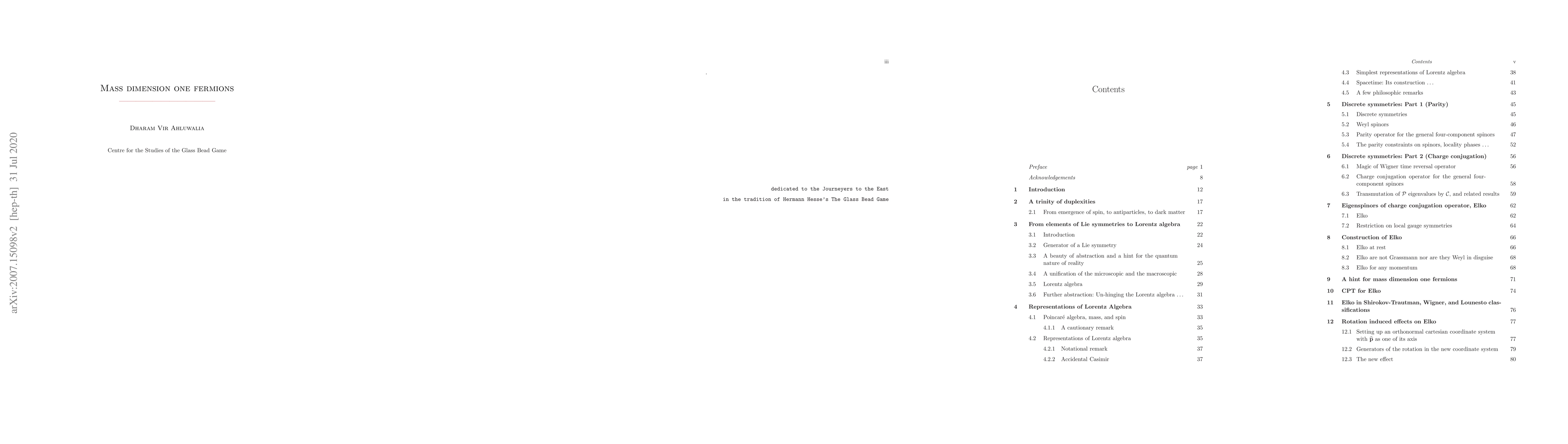 In 2005, Dharam Ahluwalia and Daniel Grumiller reported an unexpected theoretical discovery of mass dimension one fermions. These are an entirely new class of spin one half particles, and because of their mass dimensionality mismatch with the standard model fermions they are a first-principle dark matter candidate. Written by one of the physicists involved in the discovery, this is the first book to outline the discovery of mass dimension one fermions. Using a foundation of Lorentz algebra it provides a detailed construction of the eigenspinors of the charge conjugation operator (Elko) and their properties. The theory of dual spaces is then covered, before mass dimension one fermions are discussed in detail. With mass dimension one fermions having applications to cosmology and high energy physics, this book is essential for graduate students and researchers in quantum field theory, mathematical physics, and particle theory.