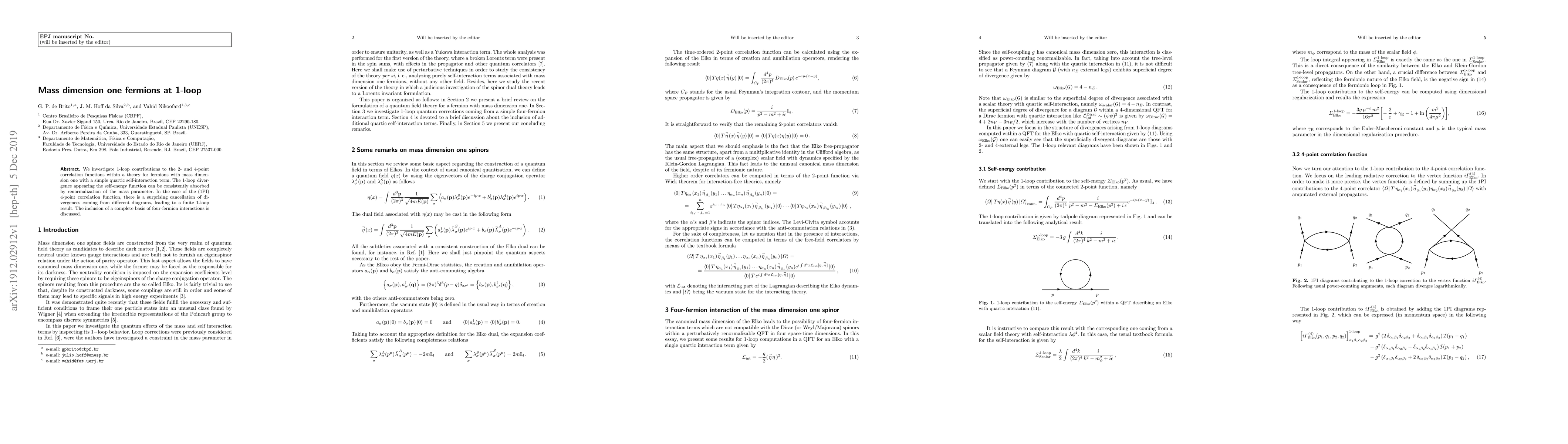 This paper examines 1-loop contributions to 2- and 4-point correlation functions in a theory of fermions with mass dimension one and a quartic self-interaction. The study finds that the 1-loop divergence in the self-energy can be absorbed through mass renormalization, and surprisingly, a cancellation of divergences in the 4-point function results in a finite 1-loop result.