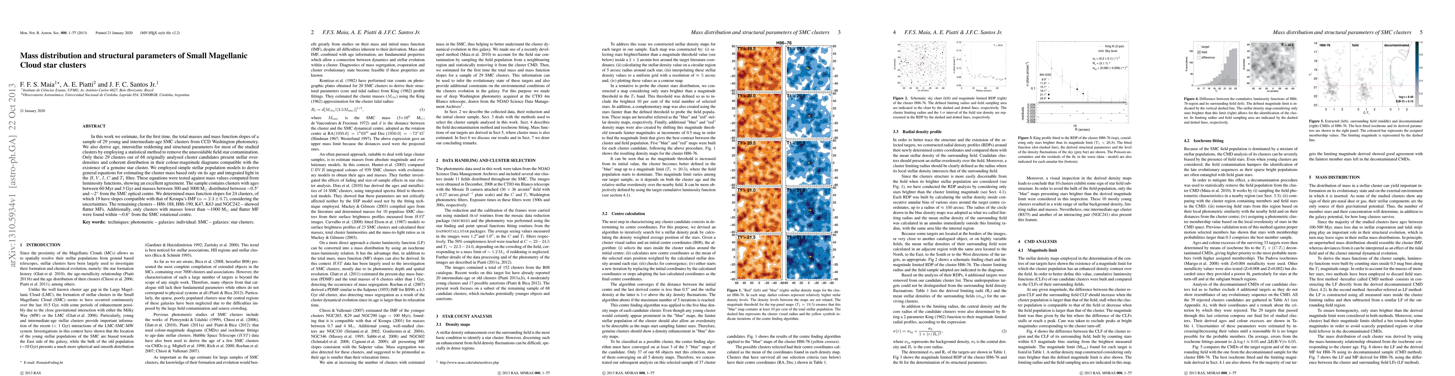 This paper estimates the total masses and mass function slopes of 29 young and intermediate-age star clusters in the Small Magellanic Cloud (SMC), revealing clusters with ages ranging from 60 Myr to 3 Gyr and masses between 300 and 3000 Mo. Most clusters exhibit mass function slopes consistent with the Kroupa IMF, except for a few with flatter slopes.