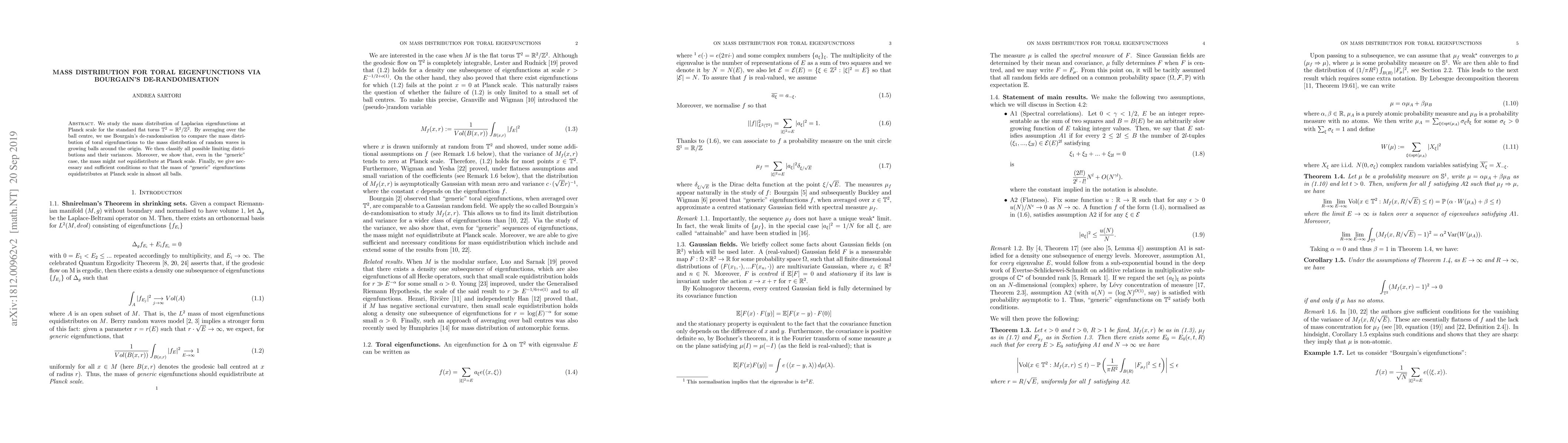 This paper explores the mass distribution of toral eigenfunctions in shrinking balls on the standard flat torus, employing Bourgain's de-randomisation technique to compare their behavior to random waves. It classifies all possible limiting distributions and variances, and provides conditions for the equidistribution of generic eigenfunctions at Planck scale.
