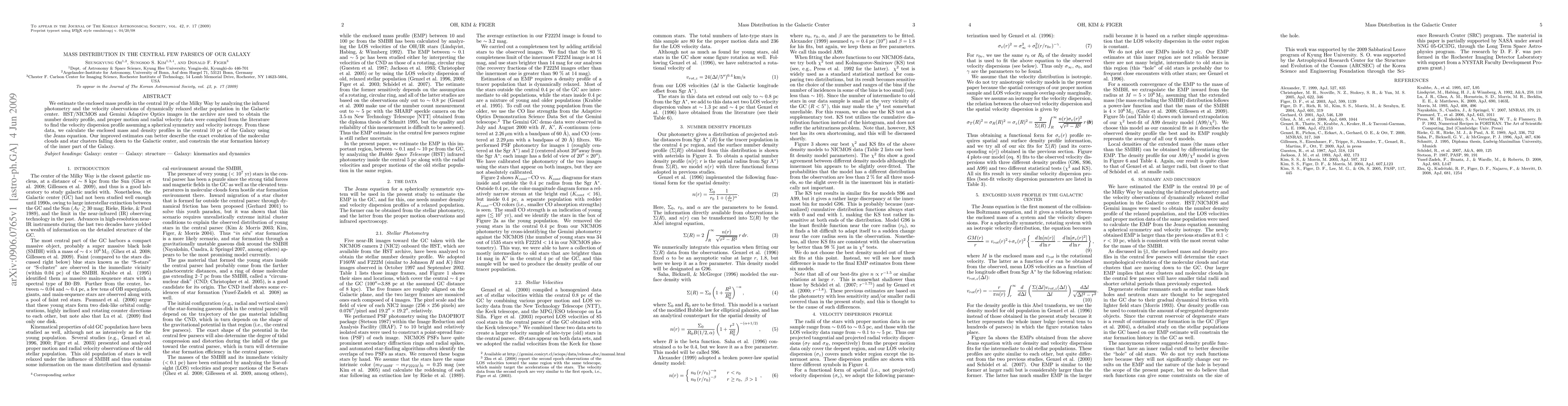 We estimate the enclosed mass profile in the central 10 pc of the Milky Way by analyzing the infrared photometry and the velocity observations of dynamically relaxed stellar population in the Galactic center. HST/NICMOS and Gemini Adaptive Optics images in the archive are used to obtain the number density profile, and proper motion and radial velocity data were compiled from the literature to find the velocity dispersion profile assuming a spherical symmetry and velocity isotropy. From these data, we calculate the enclosed mass and density profiles in the central 10 pc of the Galaxy using the Jeans equation. Our improved estimates can better describe the exact evolution of the molecular clouds and star clusters falling down to the Galactic center, and constrain the star formation history of the inner part of the Galaxy.