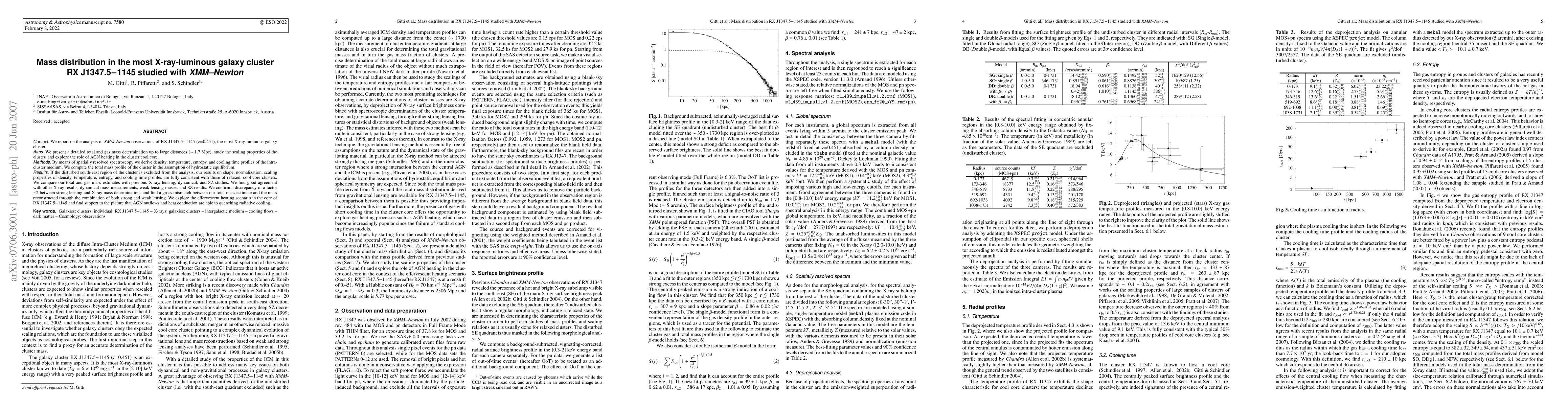 This paper analyzes XMM-Newton observations of RX J1347.5-1145, the most X-ray-luminous galaxy cluster, to determine its mass distribution and study its scaling properties. The analysis supports AGN heating in the cluster's cool core and finds good agreement with other mass estimates except for a discrepancy with strong lensing results.