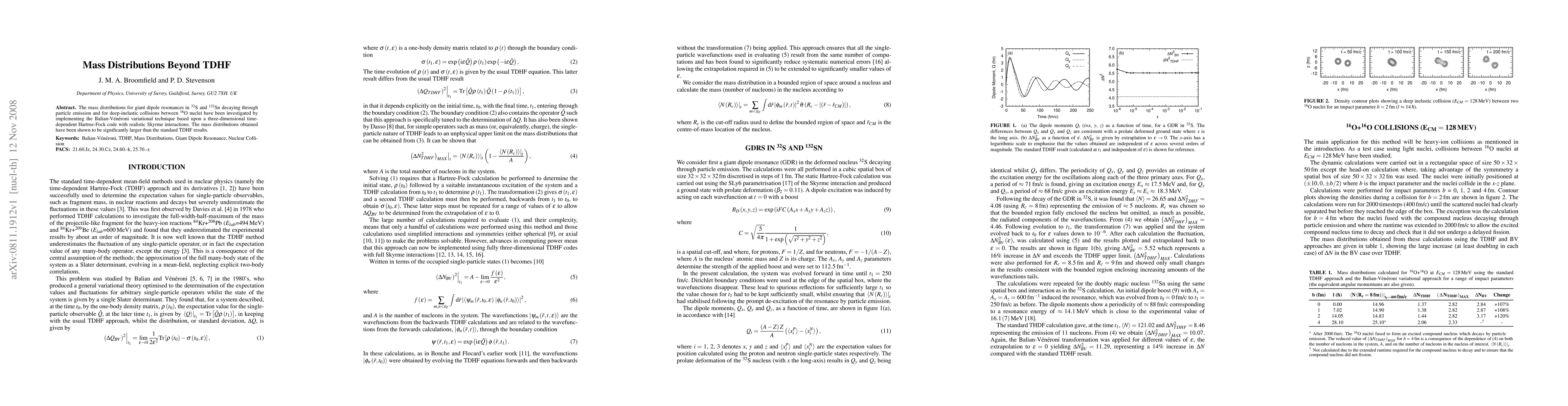This paper investigates mass distributions in giant dipole resonances and deep-inelastic collisions using a Balian-Veneroni variational technique based on three-dimensional time-dependent Hartree-Fock, revealing significantly larger mass distributions compared to standard TDHF results.
