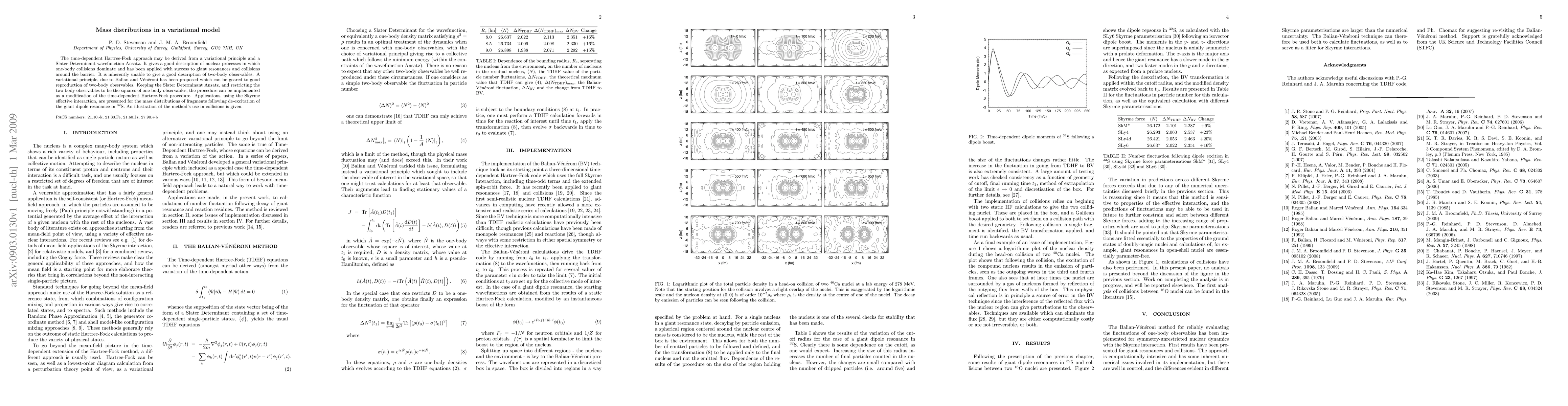 The time-dependent Hartree-Fock approach may be derived from a variational principle and a Slater Determinant wavefunction Ansatz. It gives a good description of nuclear processes in which one-body collisions dominate and has been applied with success to giant resonances and collisions around the barrier. It is inherently unable to give a good description of two-body observables. A variational principle, due to Balian and Veneroni has been proposed which can be geared to good reproduction of two-body observables. Keeping the Slater Determinant Ansatz, and restricting the two-body observables to be the squares of one-body observables, the procedure can be implemented as a modification of the time-dependent Hartree-Fock procedure. Applications, using the Skyrme effective interaction, are presented for the mass distributions of fragments following de-excitation of the giant dipole resonance in S-32. An illustration of the method's use in collisions is given.