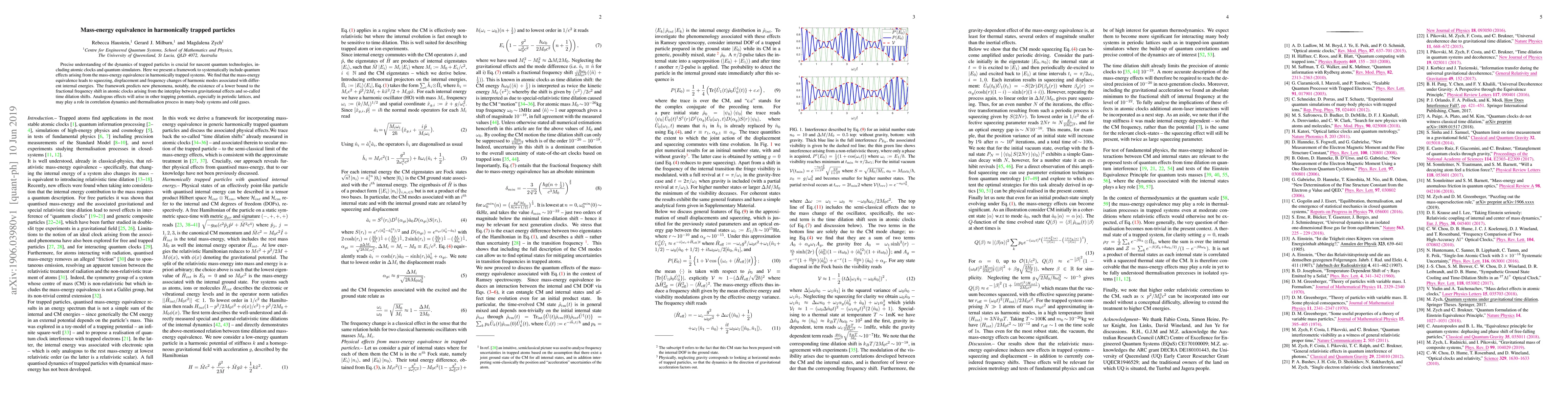 This paper develops a framework to incorporate quantum effects from mass-energy equivalence in harmonically trapped particles, revealing phenomena like squeezing and frequency shifts. It predicts a lower bound for fractional frequency shifts in atomic clocks due to gravitational and time dilation interactions, with implications for correlation dynamics and thermalization in many-body systems.