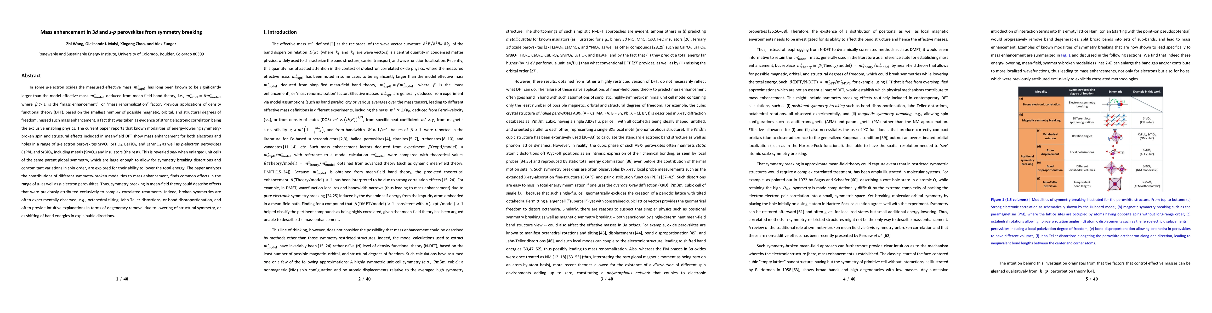In some d-electron oxides the measured effective mass m(exptl) has long been known to be significantly larger than the model effective mass m(model) deduced from mean-field band theory, i.e., m(exptl) = beta * m(model), where beta > 1 is the "mass enhancement", or "mass renormalization" factor. Previous applications of density functional theory (DFT), based on the smallest number of possible magnetic, orbital, and structural degrees of freedom, missed such mass enhancement, a fact that was taken as evidence of strong electronic correlation being the exclusive enabling physics. The current paper reports that known modalities of energy-lowering symmetry-broken spin and structural effects included in mean-field DFT show mass enhancement for both electrons and holes in a range of d-electron perovskites SrVO3, SrTiO3, BaTiO3, and LaMnO3 as well as p-electron perovskites CsPbI3 and SrBiO3, including metals (SrVO3) and insulators (the rest). This is revealed only when enlarged unit cells of the same parent global symmetry, which are large enough to allow for symmetry breaking distortions and concomitant variations in spin order, are explored for their ability to lower the total energy. The paper analyzes the contributions of different symmetry-broken modalities to mass enhancement, finds common effects in the range of d- as well as p-electron perovskites. Thus, symmetry breaking in mean-field theory could describe effects that were previously attributed exclusively to complex correlated treatments. Indeed, broken symmetries are often experimentally observed, e.g., octahedral tilting, Jahn-Teller distortions, or bond disproportionation, and often provide intuitive explanations in terms of degeneracy removal due to lowering of structural symmetry, or as shifting of band energies in explainable directions.