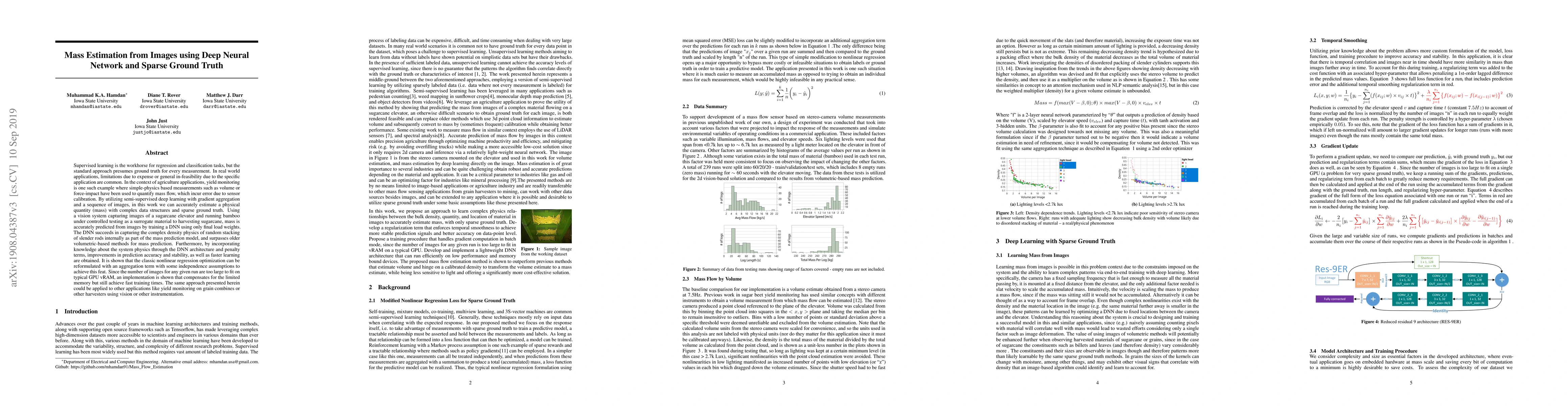 Supervised learning is the workhorse for regression and classification tasks, but the standard approach presumes ground truth for every measurement. In real world applications, limitations due to expense or general in-feasibility due to the specific application are common. In the context of agriculture applications, yield monitoring is one such example where simple-physics based measurements such as volume or force-impact have been used to quantify mass flow, which incur error due to sensor calibration. By utilizing semi-supervised deep learning with gradient aggregation and a sequence of images, in this work we can accurately estimate a physical quantity (mass) with complex data structures and sparse ground truth. Using a vision system capturing images of a sugarcane elevator and running bamboo under controlled testing as a surrogate material to harvesting sugarcane, mass is accurately predicted from images by training a DNN using only final load weights. The DNN succeeds in capturing the complex density physics of random stacking of slender rods internally as part of the mass prediction model, and surpasses older volumetric-based methods for mass prediction. Furthermore, by incorporating knowledge about the system physics through the DNN architecture and penalty terms, improvements in prediction accuracy and stability, as well as faster learning are obtained. It is shown that the classic nonlinear regression optimization can be reformulated with an aggregation term with some independence assumptions to achieve this feat. Since the number of images for any given run are too large to fit on typical GPU vRAM, an implementation is shown that compensates for the limited memory but still achieve fast training times. The same approach presented herein could be applied to other applications like yield monitoring on grain combines or other harvesters using vision or other instrumentation.