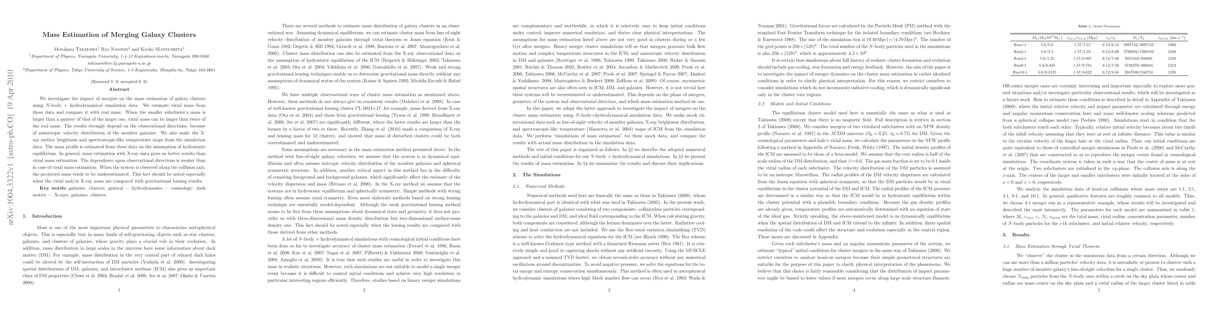 We investigate the impact of mergers on the mass estimation of galaxy clusters using $N$-body + hydrodynamical simulation data. We estimate virial mass from these data and compare it with real mass. When the smaller subcluster's mass is larger than a quarter of that of the larger one, virial mass can be larger than twice of the real mass. The results strongly depend on the observational directions, because of anisotropic velocity distribution of the member galaxies. We also make the X-ray surface brightness and spectroscopic-like temperature maps from the simulation data. The mass profile is estimated from these data on the assumption of hydrostatic equilibrium. In general, mass estimation with X-ray data gives us better results than virial mass estimation. The dependence upon observational directions is weaker than in case of virial mass estimation. When the system is observed along the collision axis, the projected mass tends to be underestimated. This fact should be noted especially when the virial and/or X-ray mass are compared with gravitational lensing results.