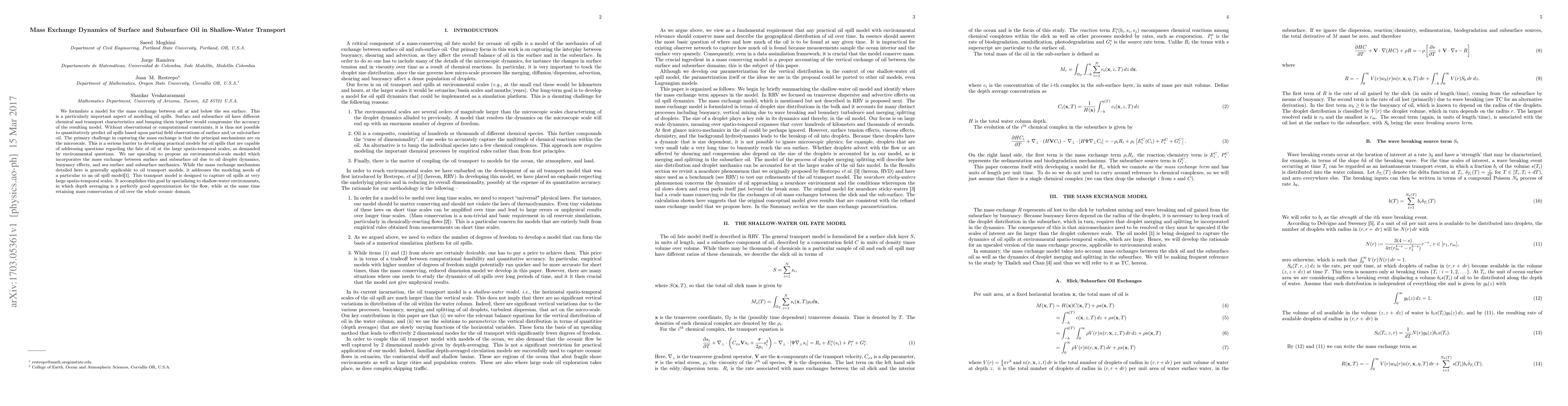 We formulate a model for the mass exchange between oil at and below the sea surface. This is a particularly important aspect of modeling oil spills. Surface and subsurface oil have different chemical and transport characteristics and lumping them together would compromise the accuracy of the resulting model. Without observational or computational constraints, it is thus not possible to quantitatively predict oil spills based upon partial field observations of surface and/or sub-surface oil. The primary challenge in capturing the mass exchange is that the principal mechanisms are on the microscale. This is a serious barrier to developing practical models for oil spills that are capable of addressing questions regarding the fate of oil at the large spatio-temporal scales, as demanded by environmental questions. We use upscaling to propose an environmental-scale model which incorporates the mass exchange between surface and subsurface oil due to oil droplet dynamics, buoyancy effects, and sea surface and subsurface mechanics. While the mass exchange mechanism detailed here is generally applicable to oil transport models, it addresses the modeling needs of a particular to an oil spill model [1]. This transport model is designed to capture oil spills at very large spatio-temporal scales. It accomplishes this goal by specializing to shallow-water environments, in which depth averaging is a perfectly good approximation for the flow, while at the same time retaining mass conservation of oil over the whole oceanic domain.