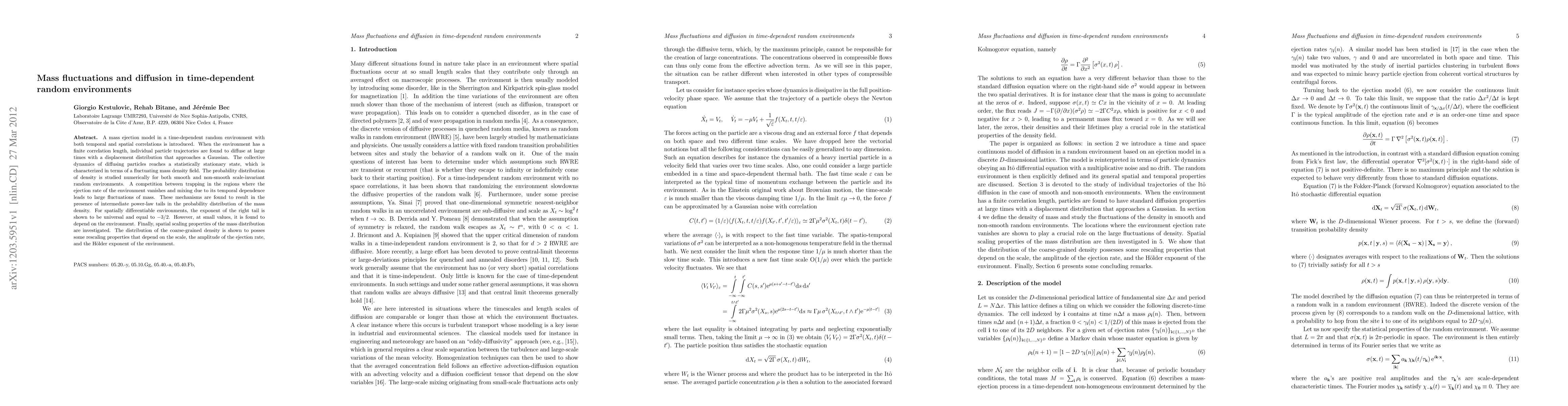 A mass ejection model in a time-dependent random environment with both temporal and spatial correlations is introduced. When the environment has a finite correlation length, individual particle trajectories are found to diffuse at large times with a displacement distribution that approaches a Gaussian. The collective dynamics of diffusing particles reaches a statistically stationary state, which is characterized in terms of a fluctuating mass density field. The probability distribution of density is studied numerically for both smooth and non-smooth scale-invariant random environments. A competition between trapping in the regions where the ejection rate of the environment vanishes and mixing due to its temporal dependence leads to large fluctuations of mass. These mechanisms are found to result in the presence of intermediate power-law tails in the probability distribution of the mass density. For spatially differentiable environments, the exponent of the right tail is shown to be universal and equal to -3/2. However, at small values, it is found to depend on the environment. Finally, spatial scaling properties of the mass distribution are investigated. The distribution of the coarse-grained density is shown to posses some rescaling properties that depend on the scale, the amplitude of the ejection rate, and the H\"older exponent of the environment.