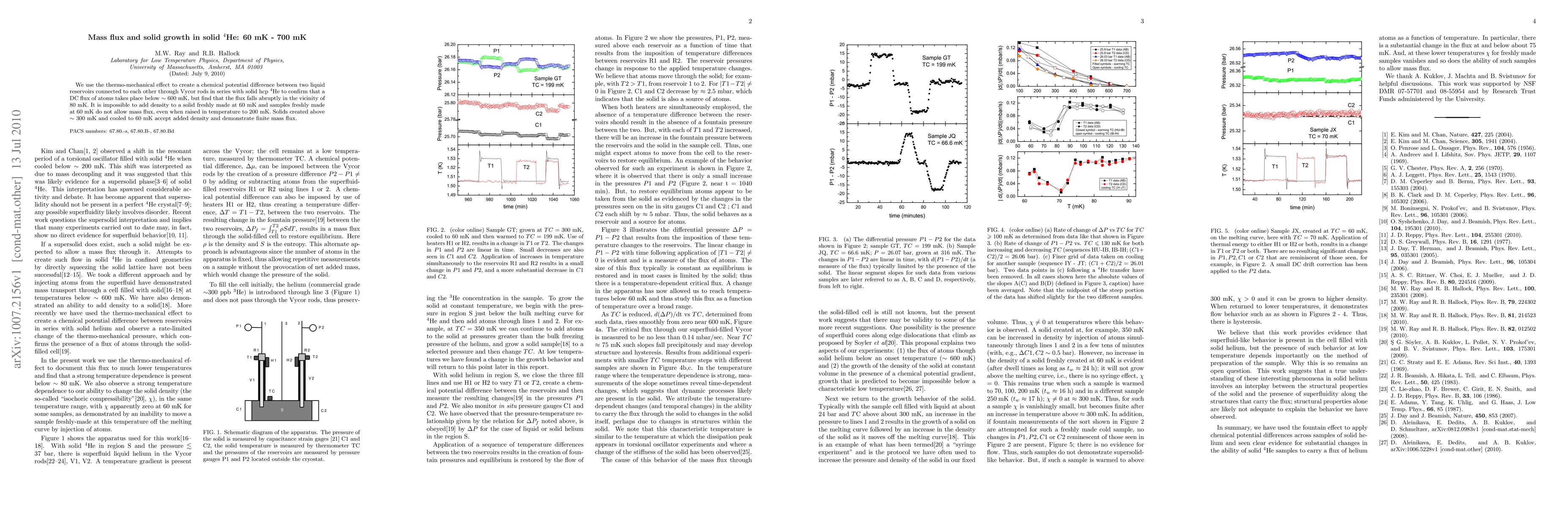 This study investigates the mass flux and solid growth in solid 4He between 60 mK and 700 mK, finding a DC flux of atoms below 600 mK but a sharp decline near 80 mK. Solids formed at 60 mK do not allow mass flux, even when warmed to 200 mK, while those formed above 300 mK and cooled to 60 mK do permit added density and mass flux.