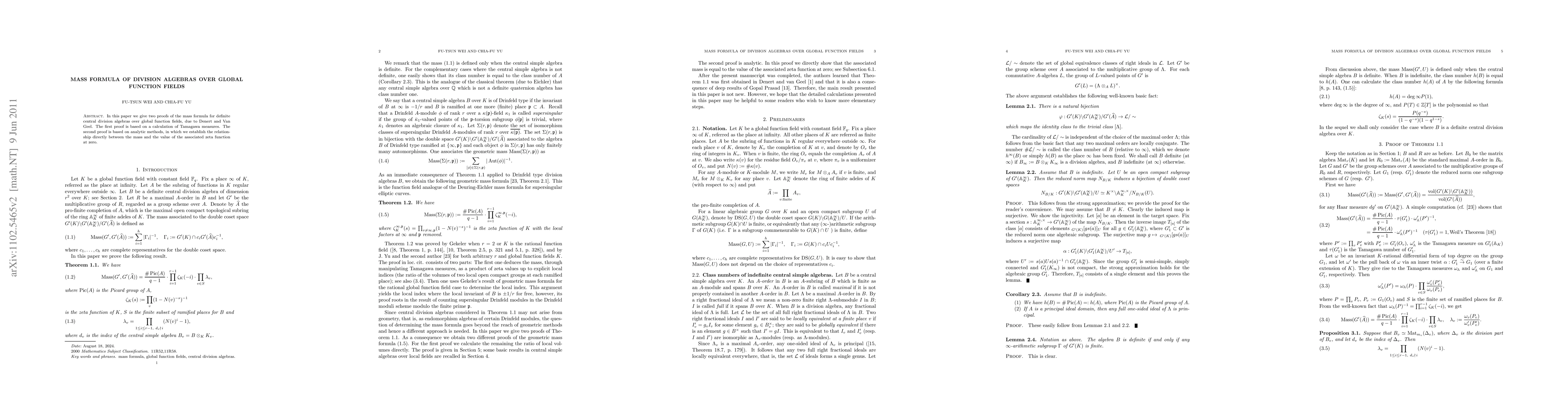 In this paper we give two proofs of the mass formula for definite central division algebras over global function fields, due to Denert and Van Geel. The first proof is based on a calculation of Tamagawa measures. The second proof is based on analytic methods, in which we establish the relationship directly between the mass and the value of the associated zeta function at zero.
