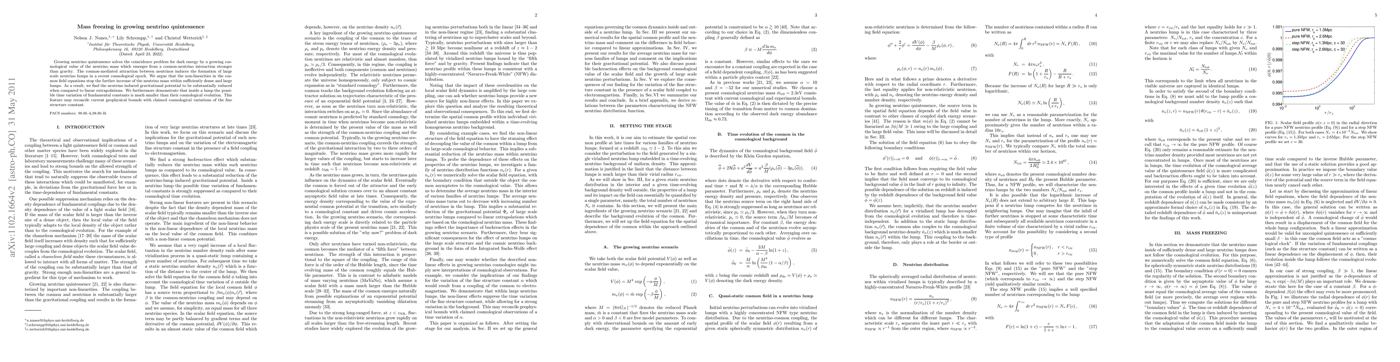 Growing neutrino quintessence solves the coincidence problem for dark energy by a growing cosmological value of the neutrino mass which emerges from a cosmon-neutrino interaction stronger than gravity. The cosmon-mediated attraction between neutrinos induces the formation of large scale neutrino lumps in a recent cosmological epoch. We argue that the non-linearities in the cosmon field equations stop the further increase of the neutrino mass within sufficiently dense and large lumps. As a result, we find the neutrino induced gravitational potential to be substantially reduced when compared to linear extrapolations. We furthermore demonstrate that inside a lump the possible time variation of fundamental constants is much smaller than their cosmological evolution. This feature may reconcile current geophysical bounds with claimed cosmological variations of the fine structure constant.