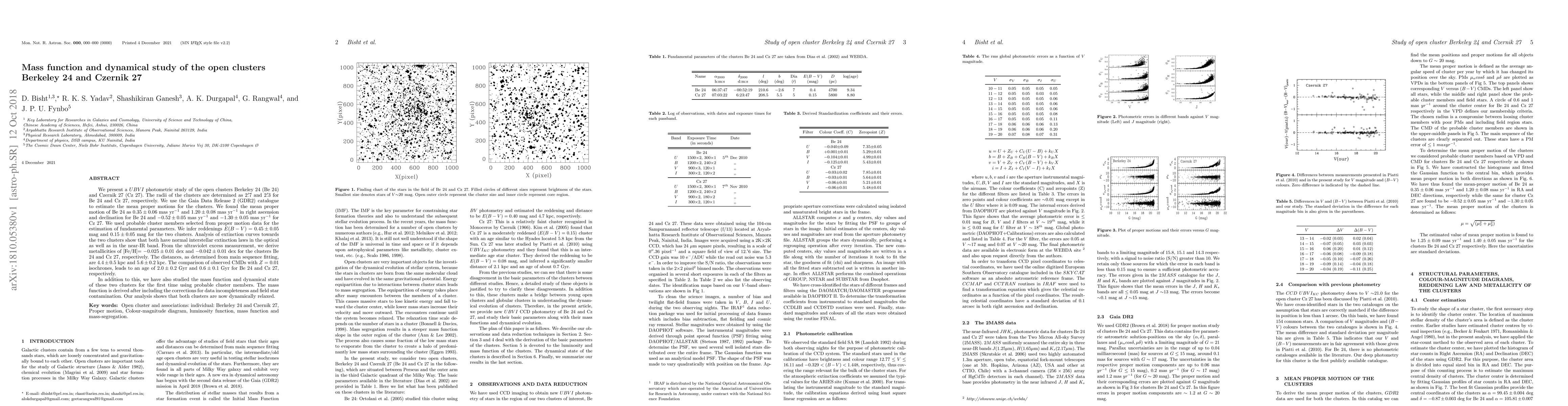 We present a $UBVI$ photometric study of the open clusters Berkeley 24 (Be 24) and Czernik 27 (Cz 27). The radii of the clusters are determined as 2\farcm7 and 2\farcm3 for Be 24 and Cz 27, respectively. We use the Gaia Data Release 2 (GDR2) catalogue to estimate the mean proper motions for the clusters. We found the mean proper motion of Be 24 as $0.35\pm0.06$ mas yr$^{-1}$ and $1.20\pm0.08$ mas yr$^{-1}$ in right ascension and declination for Be 24 and $-0.52\pm0.05$ mas yr$^{-1}$ and $-1.30\pm0.05$ mas yr$^{-1}$ for Cz 27. We used probable cluster members selected from proper motion data for the estimation of fundamental parameters. We infer reddenings $E(B-V)$ = $0.45\pm0.05$ mag and $0.15\pm0.05$ mag for the two clusters. Analysis of extinction curves towards the two clusters show that both have normal interstellar extinction laws in the optical as well as in the near-IR band. From the ultraviolet excess measurement, we derive metallicities of [Fe/H]= $-0.025\pm0.01$ dex and $-0.042\pm0.01$ dex for the clusters Be 24 and Cz 27, respectively. The distances, as determined from main sequence fitting, are $4.4\pm0.5$ kpc and $5.6\pm0.2$ kpc. The comparison of observed CMDs with $Z=0.01$ isochrones, leads to an age of $2.0\pm0.2$ Gyr and $0.6\pm0.1$ Gyr for Be 24 and Cz 27, respectively. In addition to this, we have also studied the mass function and dynamical state of these two clusters for the first time using probable cluster members. The mass function is derived after including the corrections for data incompleteness and field star contamination. Our analysis shows that both clusters are now dynamically relaxed