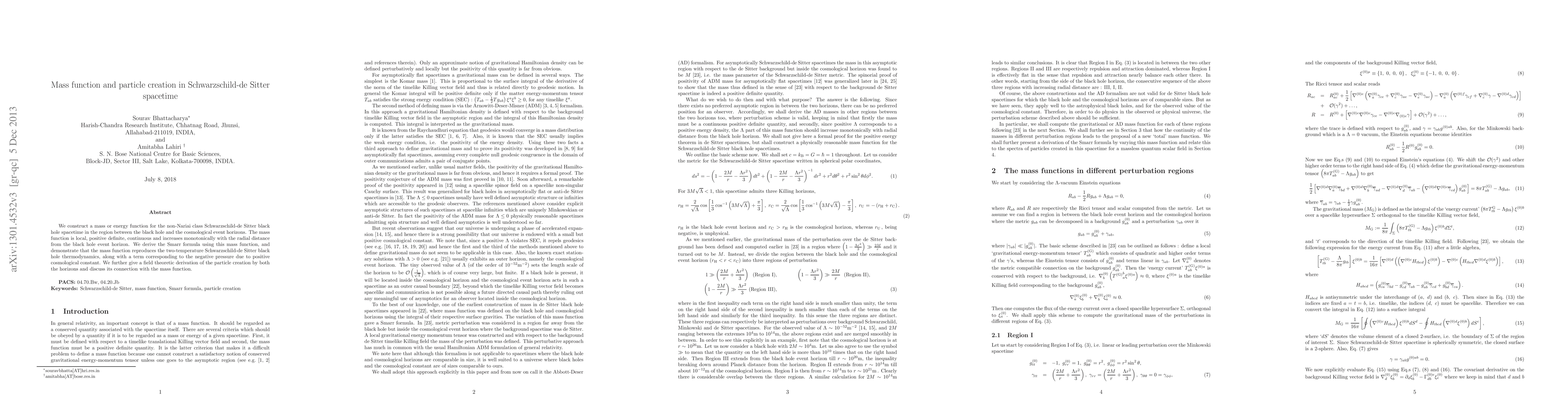 This paper constructs a local mass function for the Schwarzschild-de Sitter black hole, deriving the Smarr formula and demonstrating its thermodynamic consistency. It also explores particle creation by both the black hole and cosmological horizons, linking it to the mass function.