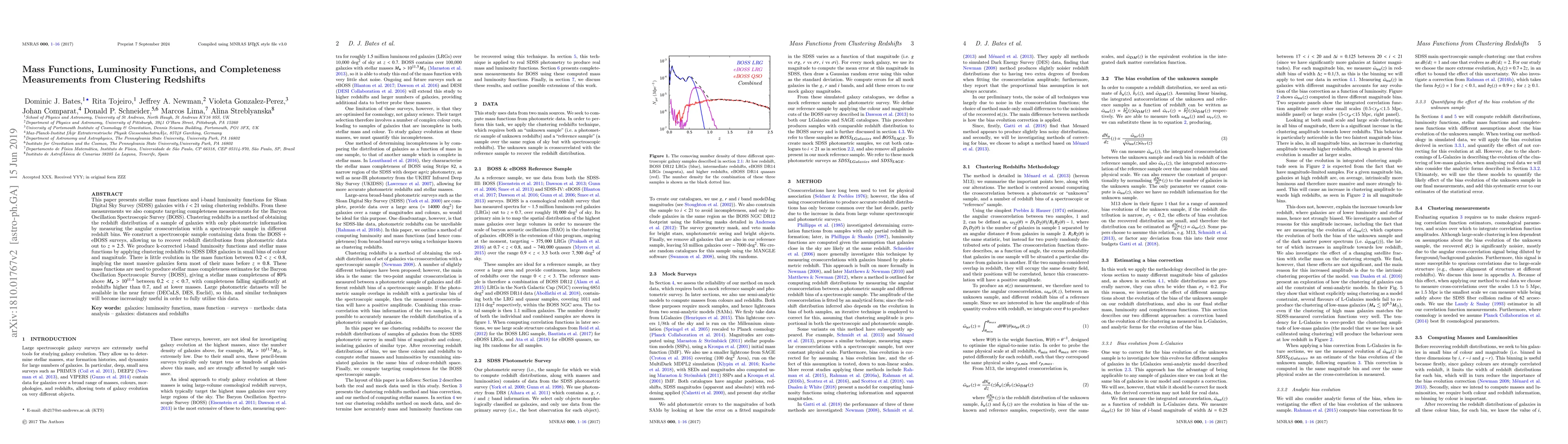 This paper derives stellar mass functions and i-band luminosity functions for SDSS galaxies using clustering redshifts, revealing little evolution in the mass function before $z=0.8$. It also estimates the stellar mass completeness of the BOSS survey, finding 80% completeness above $M_{\star} > 10^{11.4}$ for $0.2 < z < 0.7$.