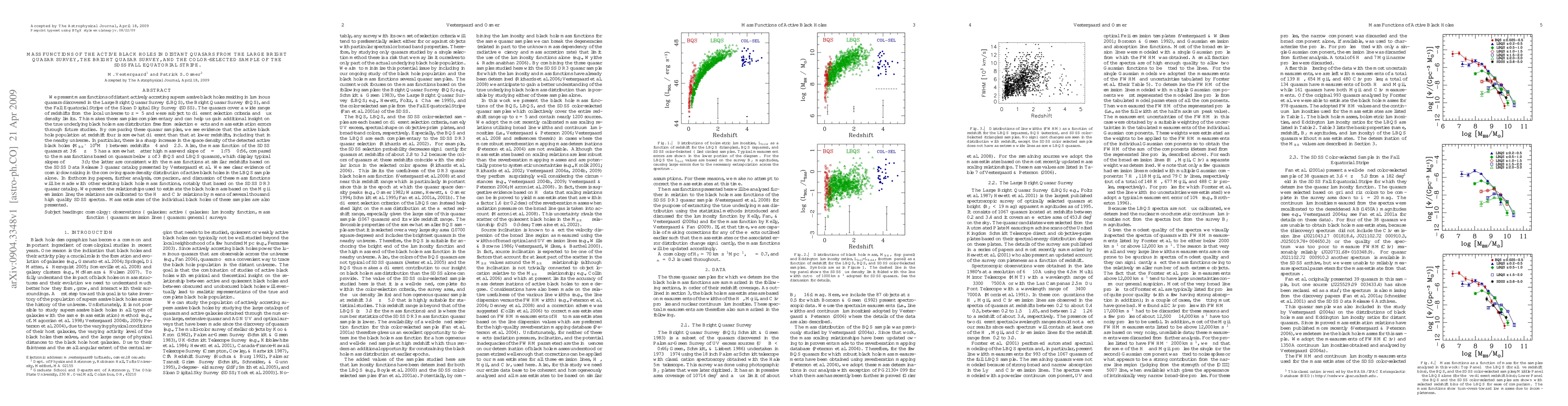 This paper presents mass functions for distant supermassive black holes in quasars from three surveys, revealing a sharp increase in active black hole space density between redshifts ~4 and ~2.5. The study highlights differences in mass distribution and cosmic downsizing, with the z~4 population showing a flatter high mass-end slope compared to lower redshifts.