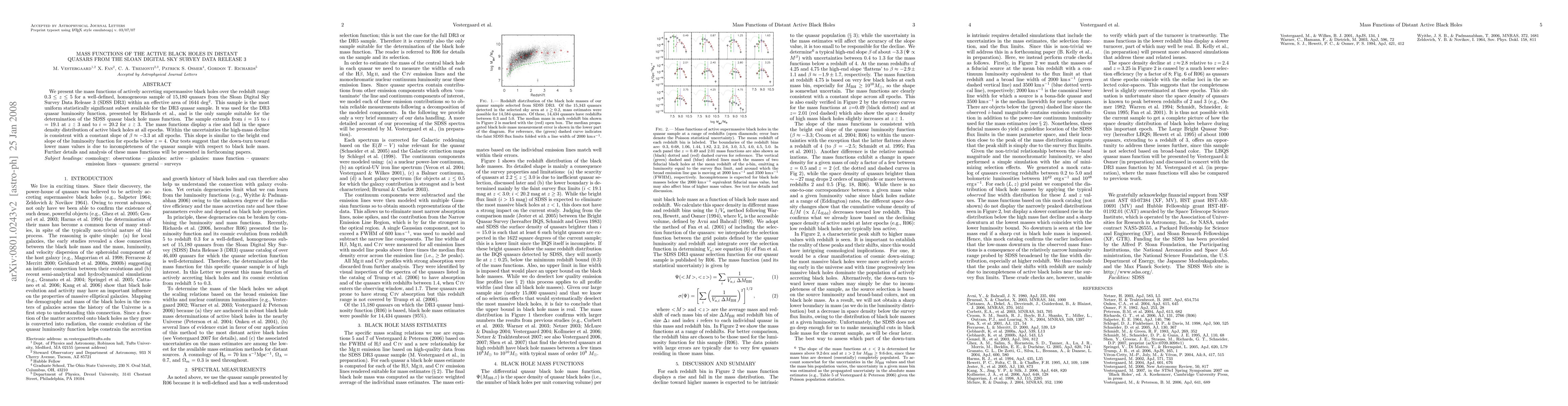 We present the mass functions of actively accreting supermassive black holes over the redshift range 0.3 <= z <= 5 for a well-defined, homogeneous sample of 15,180 quasars from the Sloan Digital Sky Survey Data Release 3 (SDSS DR3) within an effective area of 1644 square degrees. This sample is the most uniform statistically significant subset available for the DR3 quasar sample. It was used for the DR3 quasar luminosity function, presented by Richards et al., and is the only sample suitable for the determination of the SDSS quasar black hole mass function. The sample extends from i = 15 to i = 19.1 at z less than about 3 and to i = 20.2 for z greater than about 3. The mass functions display a rise and fall in the space density distribution of active black holes at all epochs. Within the uncertainties the high-mass decline is consistent with a constant slope of beta of about -3.3 at all epochs. This slope is similar to the bright end slope of the luminosity function for epochs below z = 4. Our tests suggest that the down-turn toward lower mass values is due to incompleteness of the quasar sample with respect to black hole mass. Further details and analysis of these mass functions will be presented in forthcoming papers.