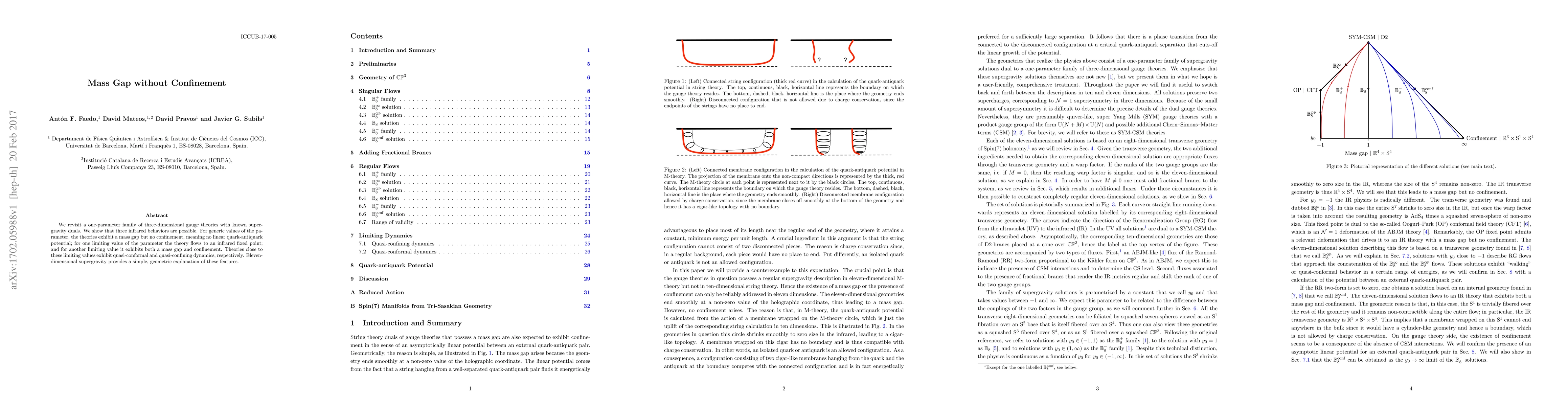 We revisit a one-parameter family of three-dimensional gauge theories with known supergravity duals. We show that three infrared behaviors are possible. For generic values of the parameter, the theories exhibit a mass gap but no confinement, meaning no linear quark-antiquark potential; for one limiting value of the parameter the theory flows to an infrared fixed point; and for another limiting value it exhibits both a mass gap and confinement. Theories close to these limiting values exhibit quasi-conformal and quasi-confining dynamics, respectively. Eleven-dimensional supergravity provides a simple, geometric explanation of these features.