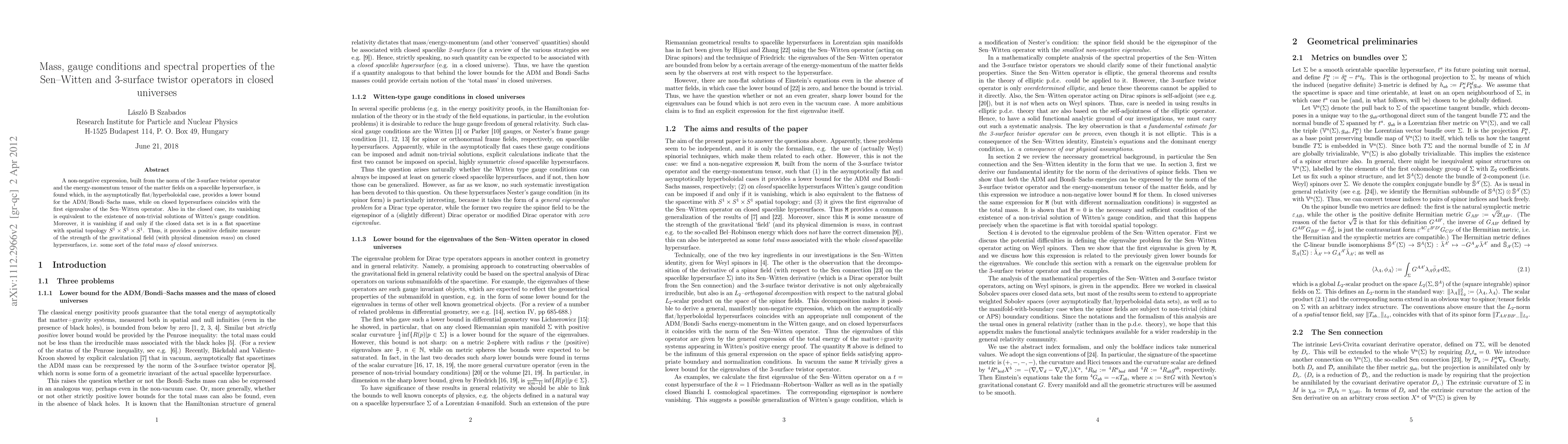 A non-negative expression, built from the norm of the 3-surface twistor operator and the energy-momentum tensor of the matter fields on a spacelike hypersurface, is found which, in the asymptotically flat/hyperboloidal case, provides a lower bound for the ADM/Bondi--Sachs mass, while on closed hypersurfaces it gives the first eigenvalue of the Sen--Witten operator. Also in the closed case, its vanishing is equivalent to the existence of non-trivial solutions of Witten's gauge condition. Moreover, it is vanishing if and only if the closed data set is in a flat spacetime with toroidal spatial topology. Thus it provides a positive definite measure of the strength of the gravitational field (with physical dimension mass) on closed hypersurfaces, i.e. some sort of the total mass of closed universes.