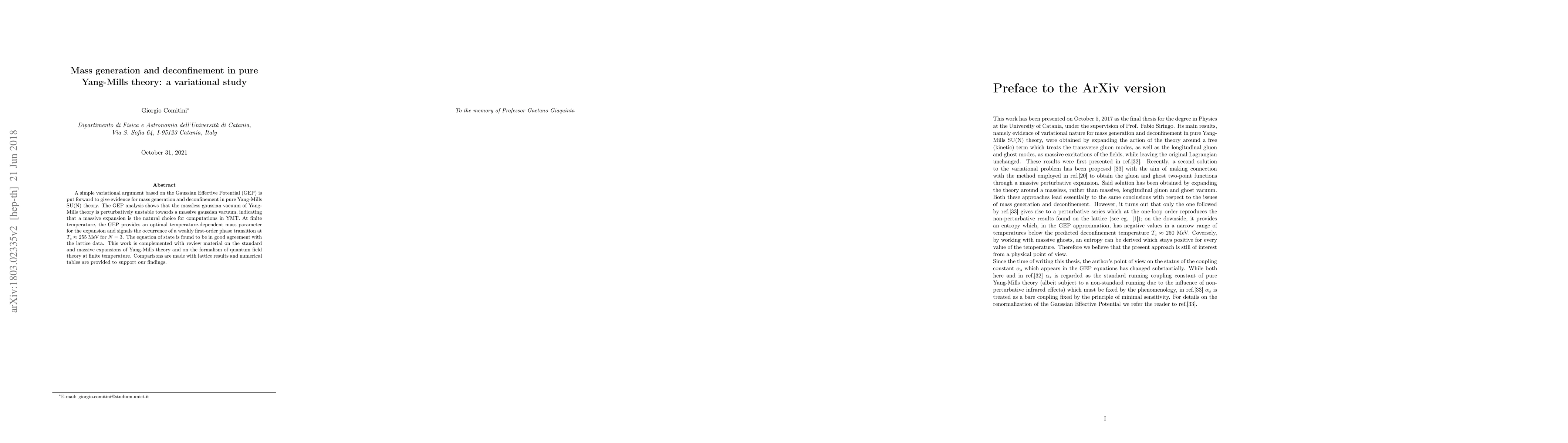 A simple variational argument based on the Gaussian Effective Potential (GEP) is put forward to give evidence for mass generation and deconfinement in pure Yang-Mills SU(N) theory. The GEP analysis shows that the massless gaussian vacuum of Yang-Mills theory is perturbatively unstable towards a massive gaussian vacuum, indicating that a massive expansion is the natural choice for computations in YMT. At finite temperature, the GEP provides an optimal temperature-dependent mass parameter for the expansion and signals the occurrence of a weakly first-order phase transition at $T_{c}\approx$ 255 MeV for $N=3$. The equation of state is found to be in good agreement with the lattice data. This work is complemented with review material on the standard and massive expansions of Yang-Mills theory and on the formalism of quantum field theory at finite temperature. Comparisons are made with lattice results and numerical tables are provided to support our findings.