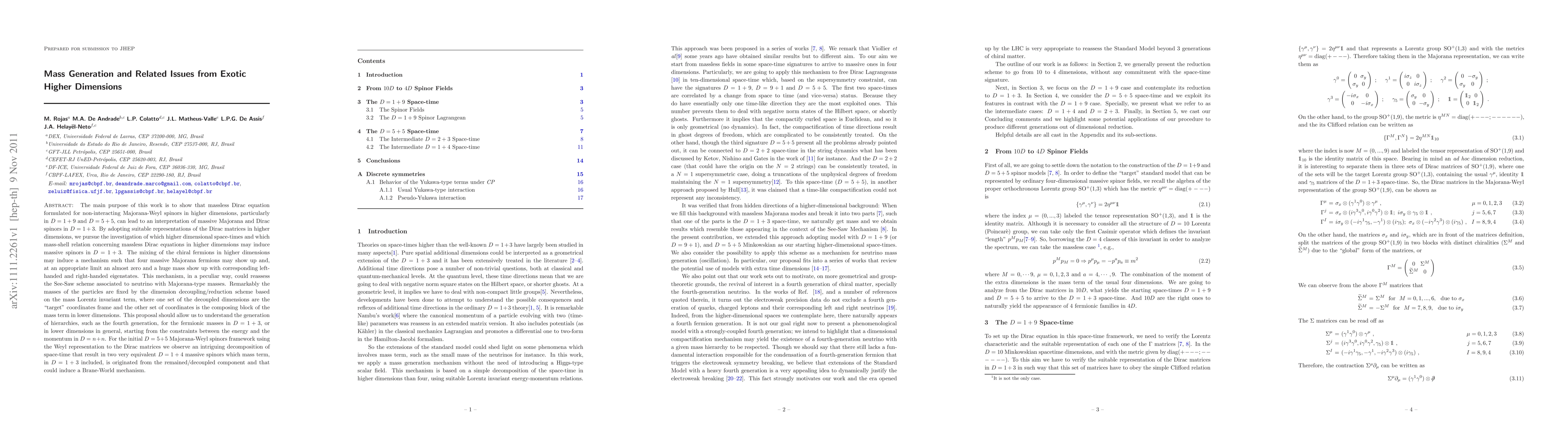 The main purpose of this work is to show that massless Dirac equation formulated for non-interacting Majorana-Weyl spinors in higher dimensions, particularly in D=1+9 and D=5+5, can lead to an interpretation of massive Majorana and Dirac spinors in D=1+3. By adopting suitable representations of the Dirac matrices in higher dimensions, we pursue the investigation of which higher dimensional space-times and which mass-shell relation concerning massless Dirac equations in higher dimensions may induce massive spinors in D=1+3. The mixing of the chiral fermions in higher dimensions may induce a mechanism such that four massive Majorana fermions may show up and, at an appropriate limit an almost zero and a huge mass show up with corresponding left-handed and right-handed eigenstates. This mechanism, in a peculiar way, could reassess the See-Saw scheme associated to neutrino with Majorana-type masses. Remarkably the masses of the particles are fixed by the dimension decoupling/reduction scheme based on the mass Lorentz invariant term, where one set of the decoupled dimensions are the "target" coordinates frame and the other set of coordinates is the composing block of the mass term in lower dimensions. This proposal should allow us to understand the generation of hierarchies, such as the fourth generation, for the fermionic masses in D=1+3, or in lower dimensions in general, starting from the constraints between the energy and the momentum in D=n+n. For the initial D=5+5 Majorana-Weyl spinors framework using the Weyl representation to the Dirac matrices we observe an intriguing decomposition of space-time that result in two very equivalent D=1+4 massive spinors which mass term, in D=1+3 included, is originated from the remained/decoupled component and that could induce a Brane-World mechanism.