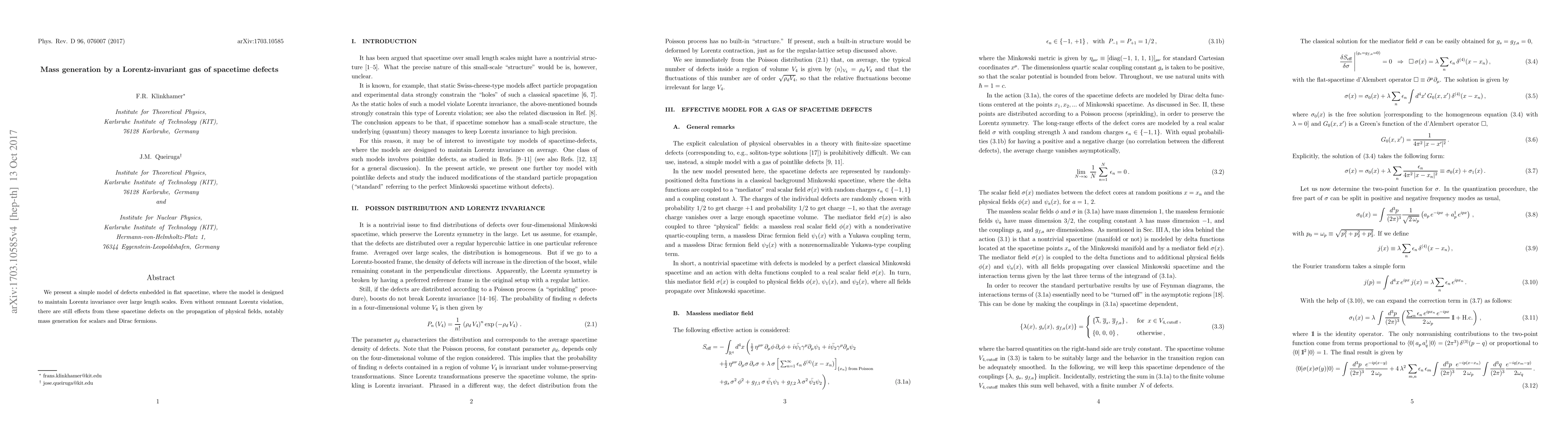 This paper proposes a model of spacetime defects that preserves Lorentz invariance, demonstrating how these defects can generate mass for scalars and Dirac fermions despite maintaining this invariance. The model highlights the influence of such defects on the propagation of physical fields.